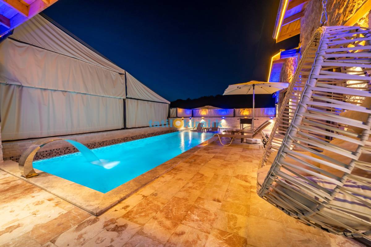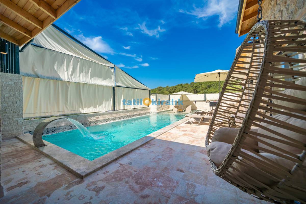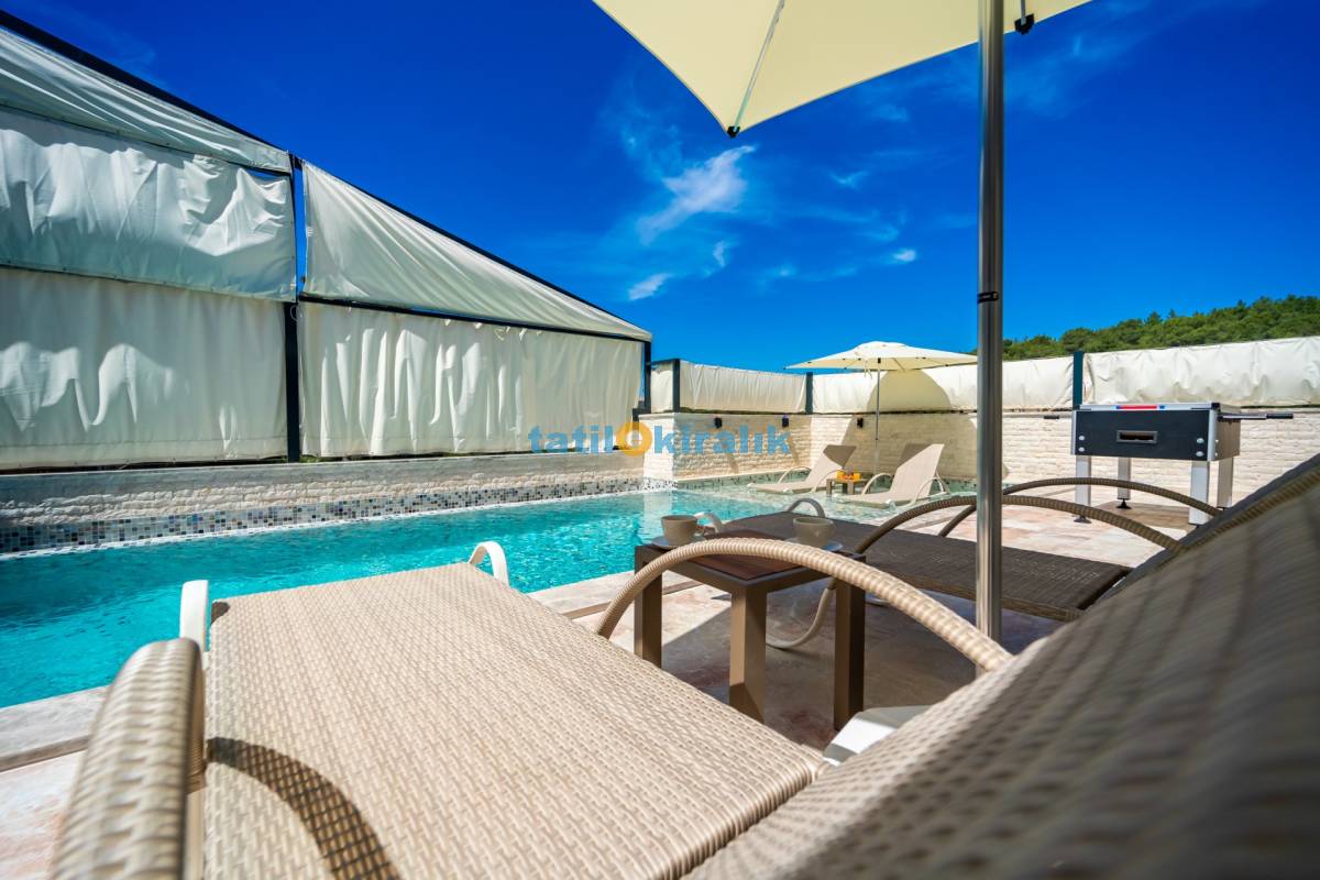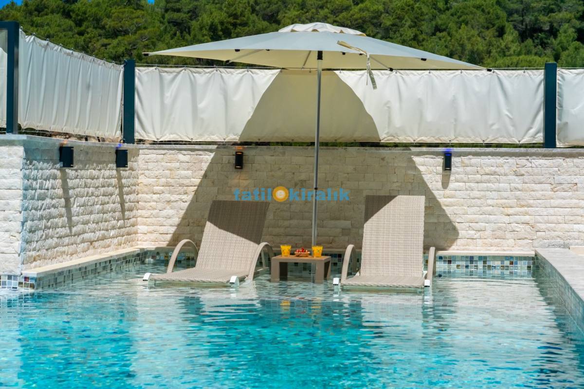 Havuz Katı Terası Detayları : Şezlonglar, barbekü, yemek masası, salıncak, oturma grubu, bulunmaktadır.