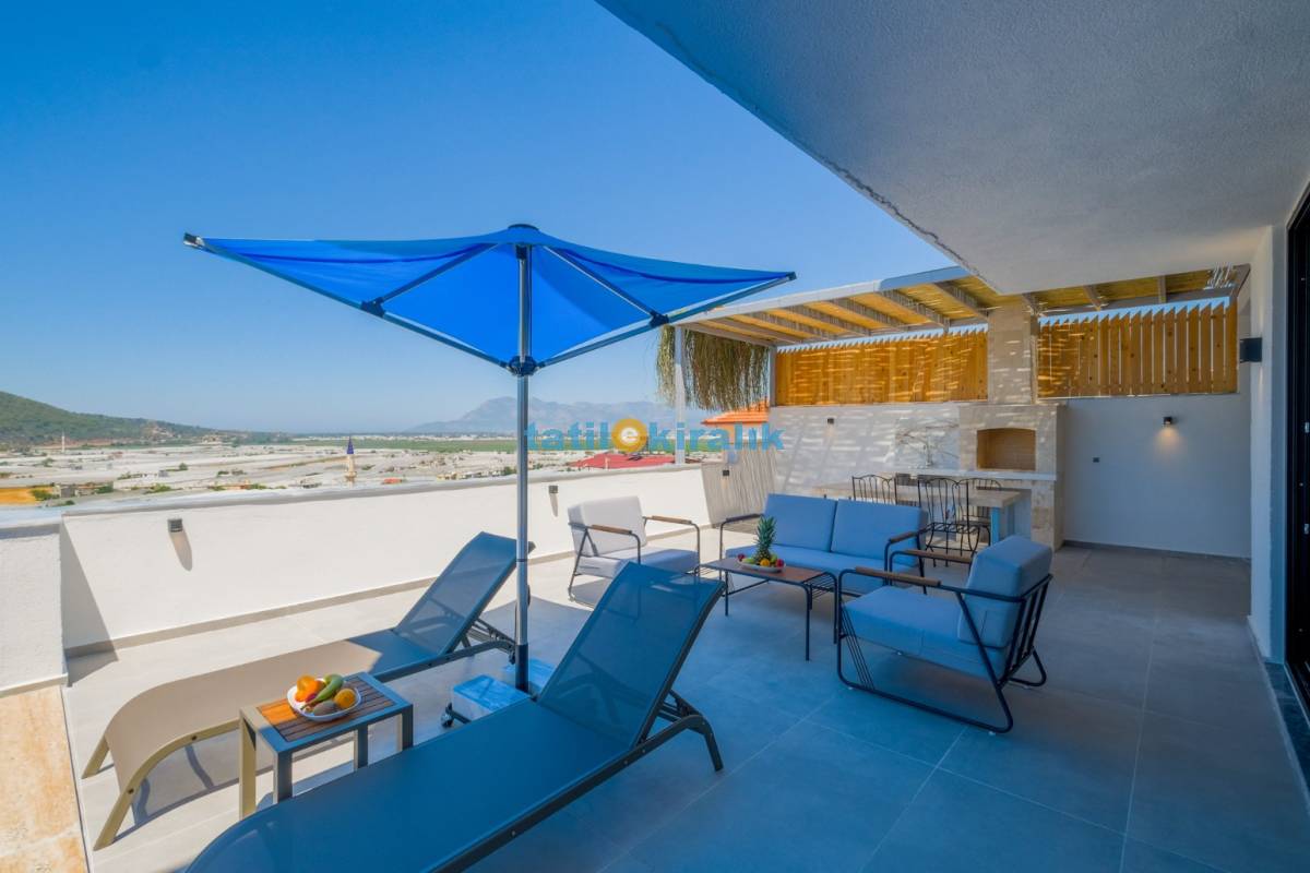 Havuz Terası Detayları : Şezlong, güneşlenme şemşiyesi, barbekü, oturma grubu, yemek masası ve sandalyeleri bulunmaktadır.