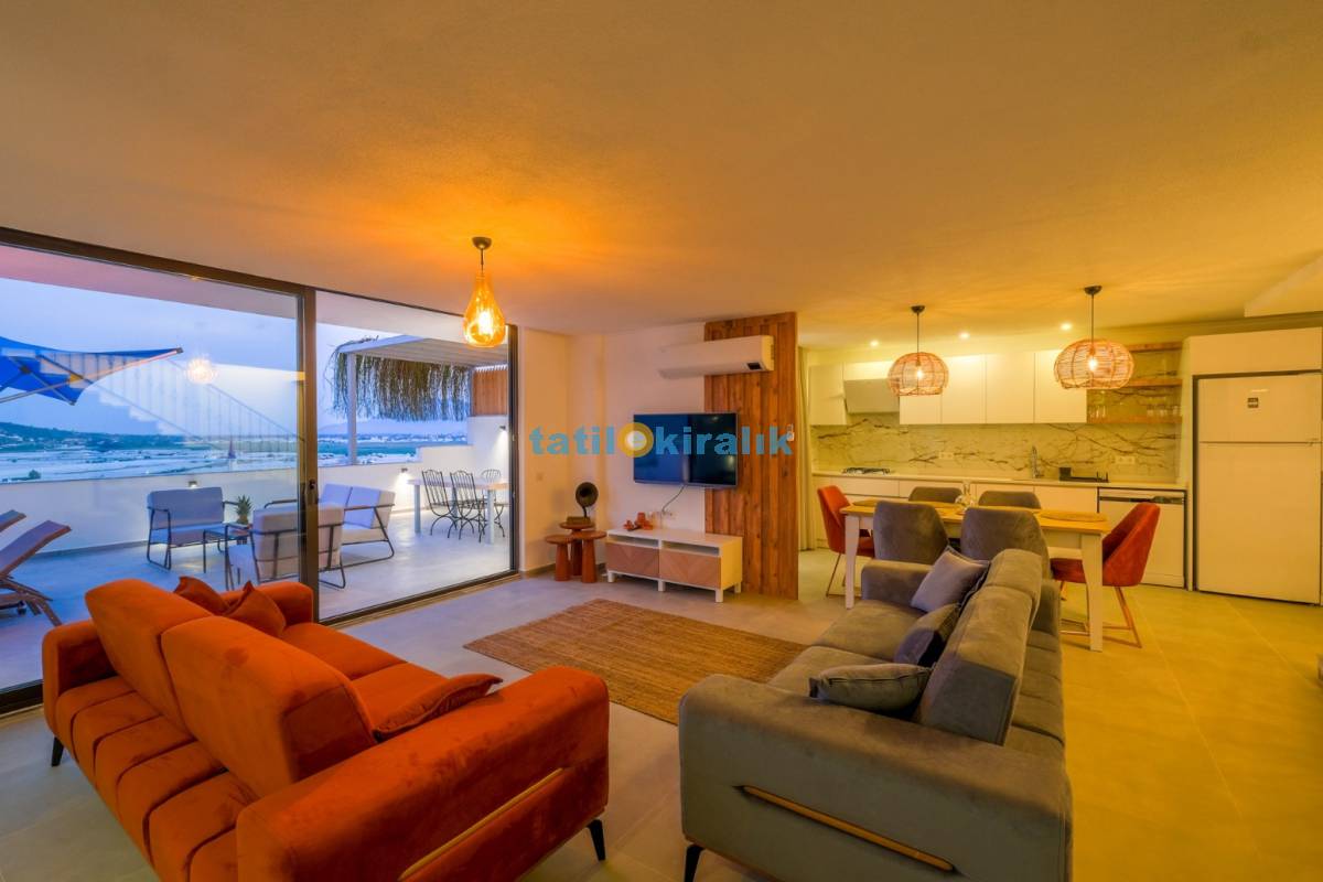 Salon Detayları: LCD TV, modern oturma grubu, yemek masası ve sandalyeler, kablosuz modem bulunmaktadır.
