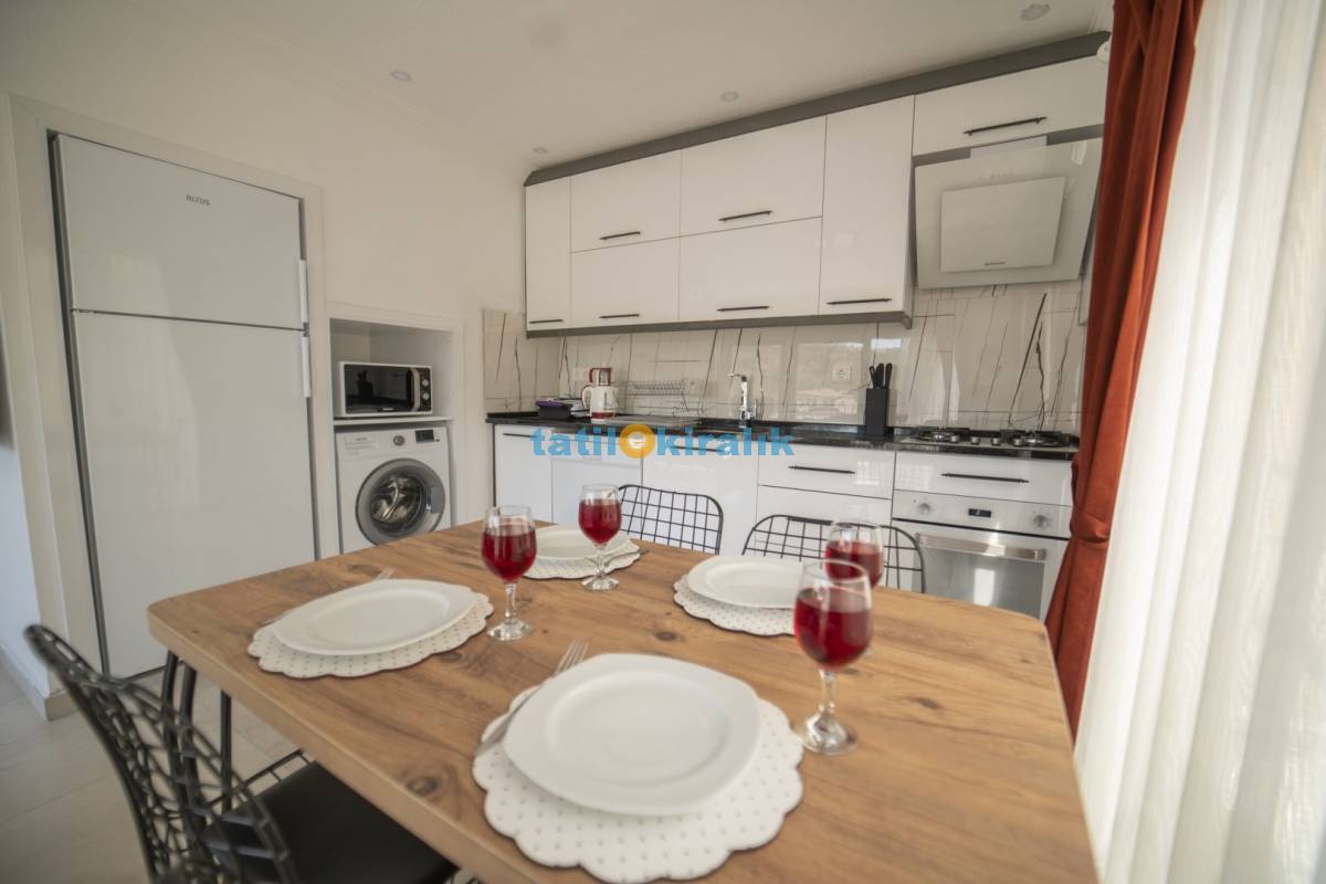 Mutfak Detayları: Buzdolabı, bulaşık makinesi, fırın, mikrodalga, tost makinesi çamaşır makinesi, yemek takımı, tava-tencere, çatal-bıçak seti bulunmaktadır.