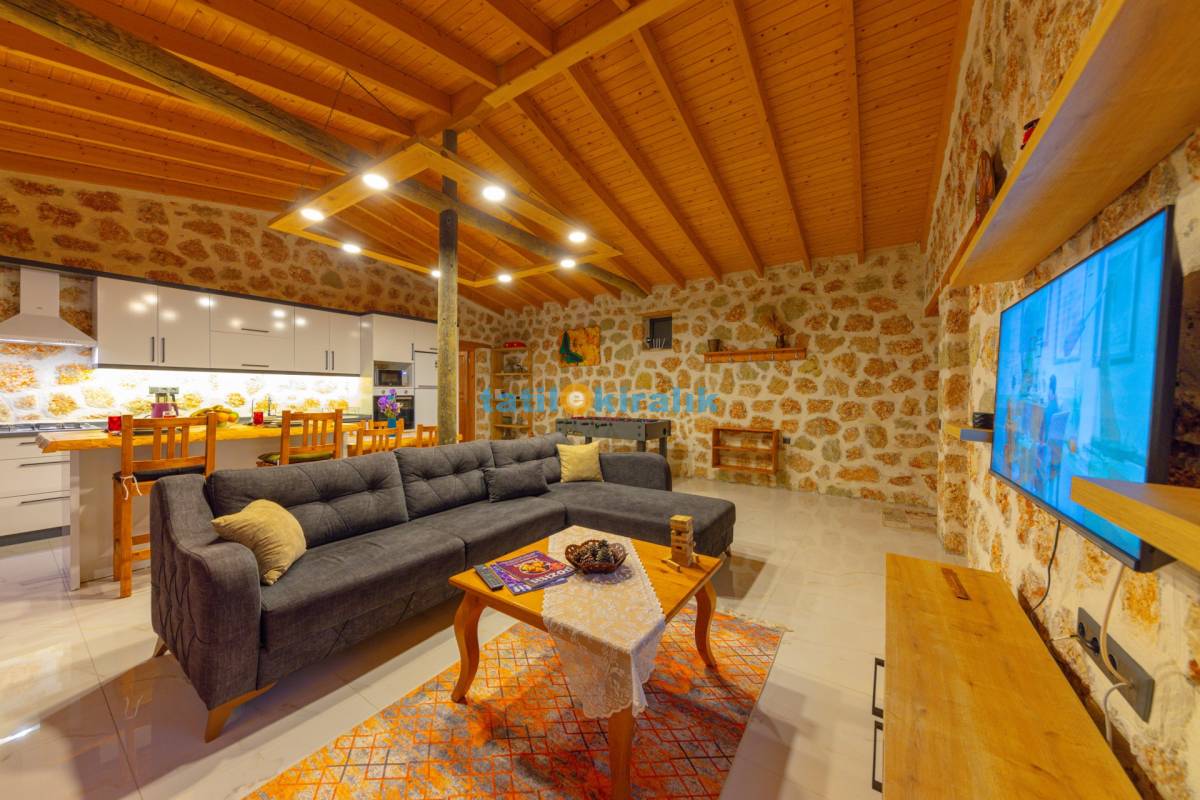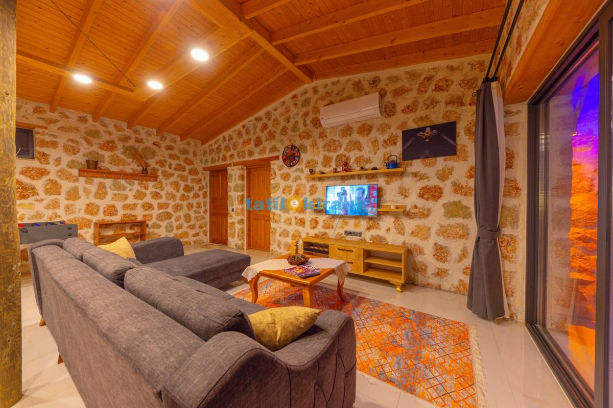 Salon Detayları: TV, modern  oturma grubu, yemek masası, klima ve  Banyo & WC bulunmaktadır.