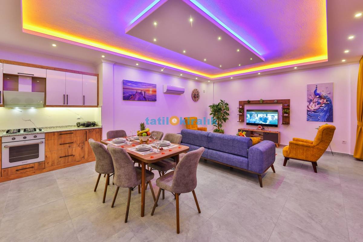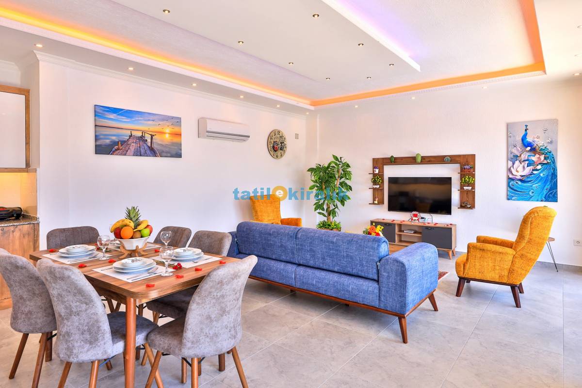 Salon Detayları: TV, modern oturma grubu, yemek masası, klima ve Banyo & WC bulunmaktadır.