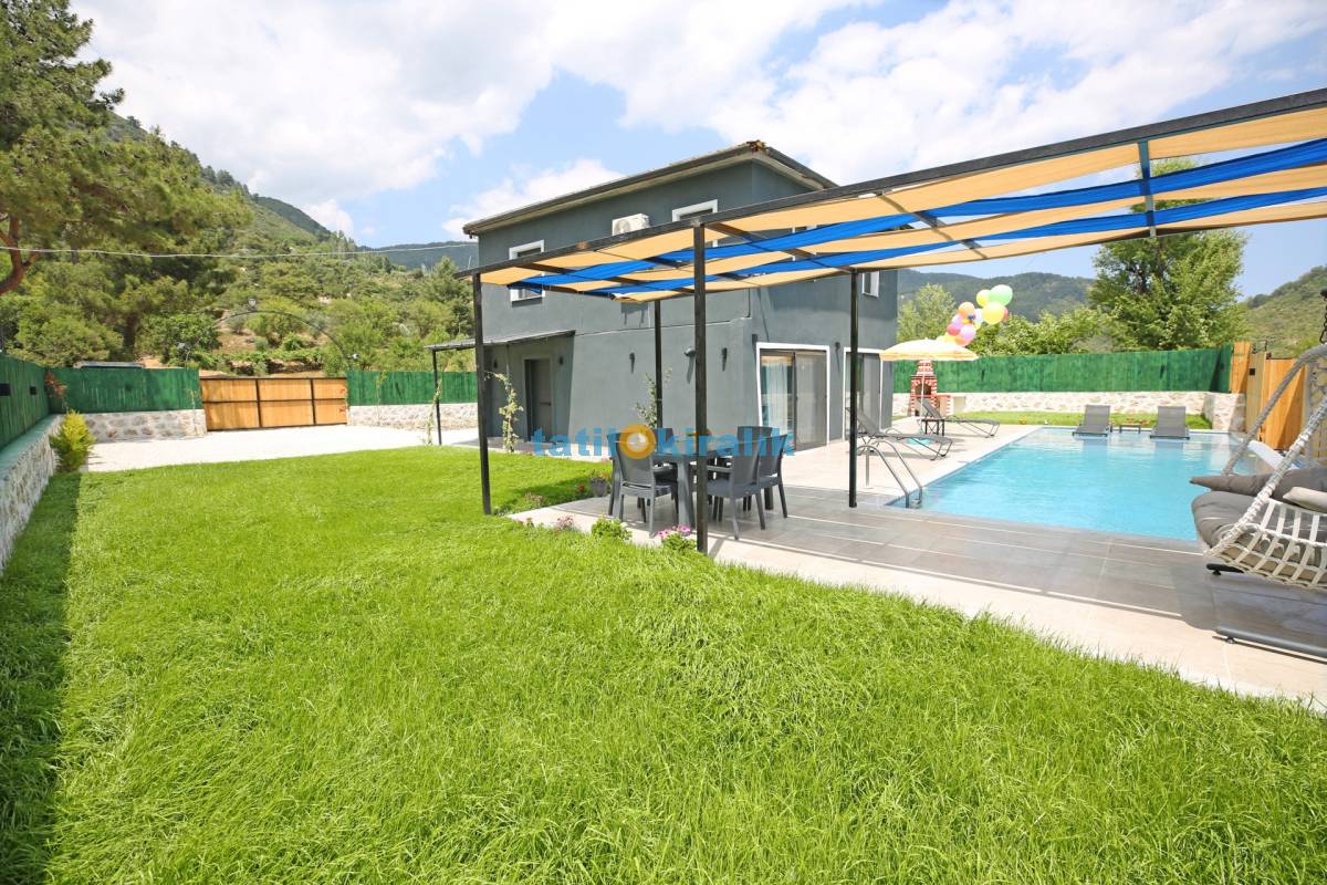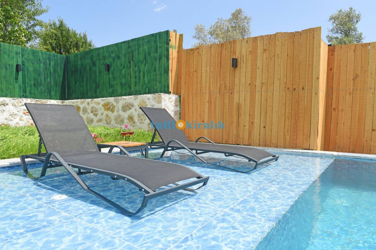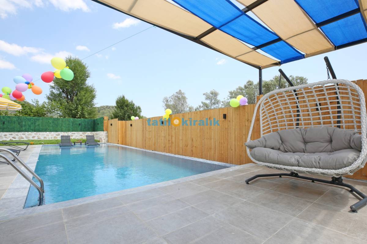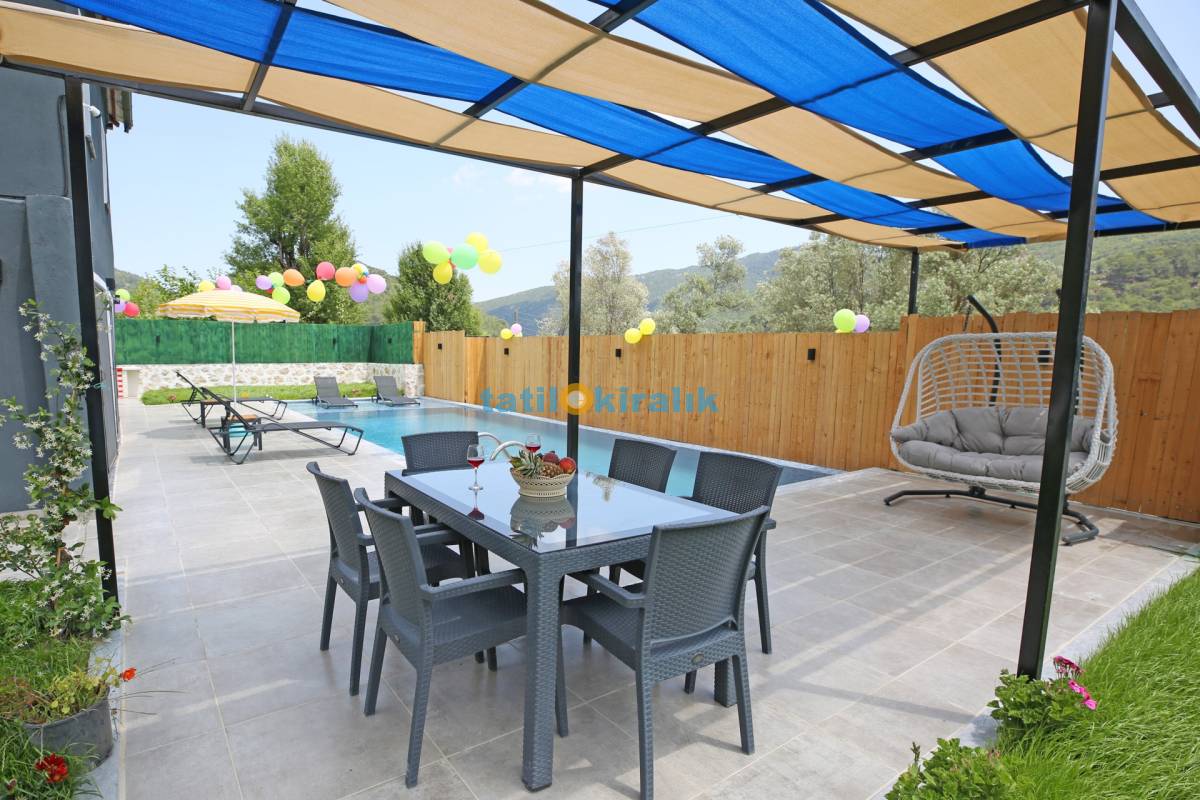 Havuz Katı Terası Detayları : Şemsiye, şezlong, yemek masası ve sandalye , barbekü, salıncak, köşk bulunmaktadır.