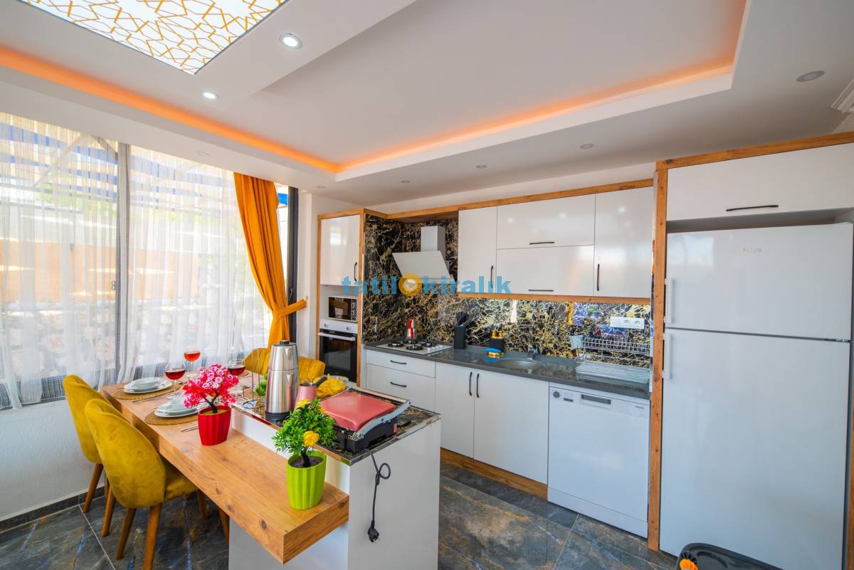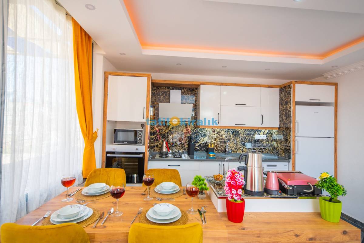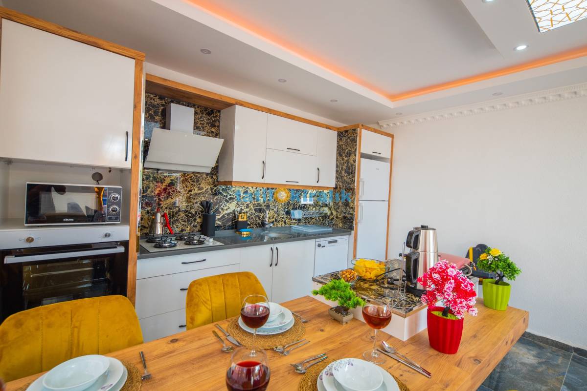 Mutfak Detayları: Buzdolabı, bulaşık makinesi, fırın, çamaşır makinesi, elektrikli su ısıtıcısı, kahve makinesi, tost makinesi, mikrodalga fırın, yemek takımı, tava-tencere, çatal-bıçak seti bulunmaktadır.