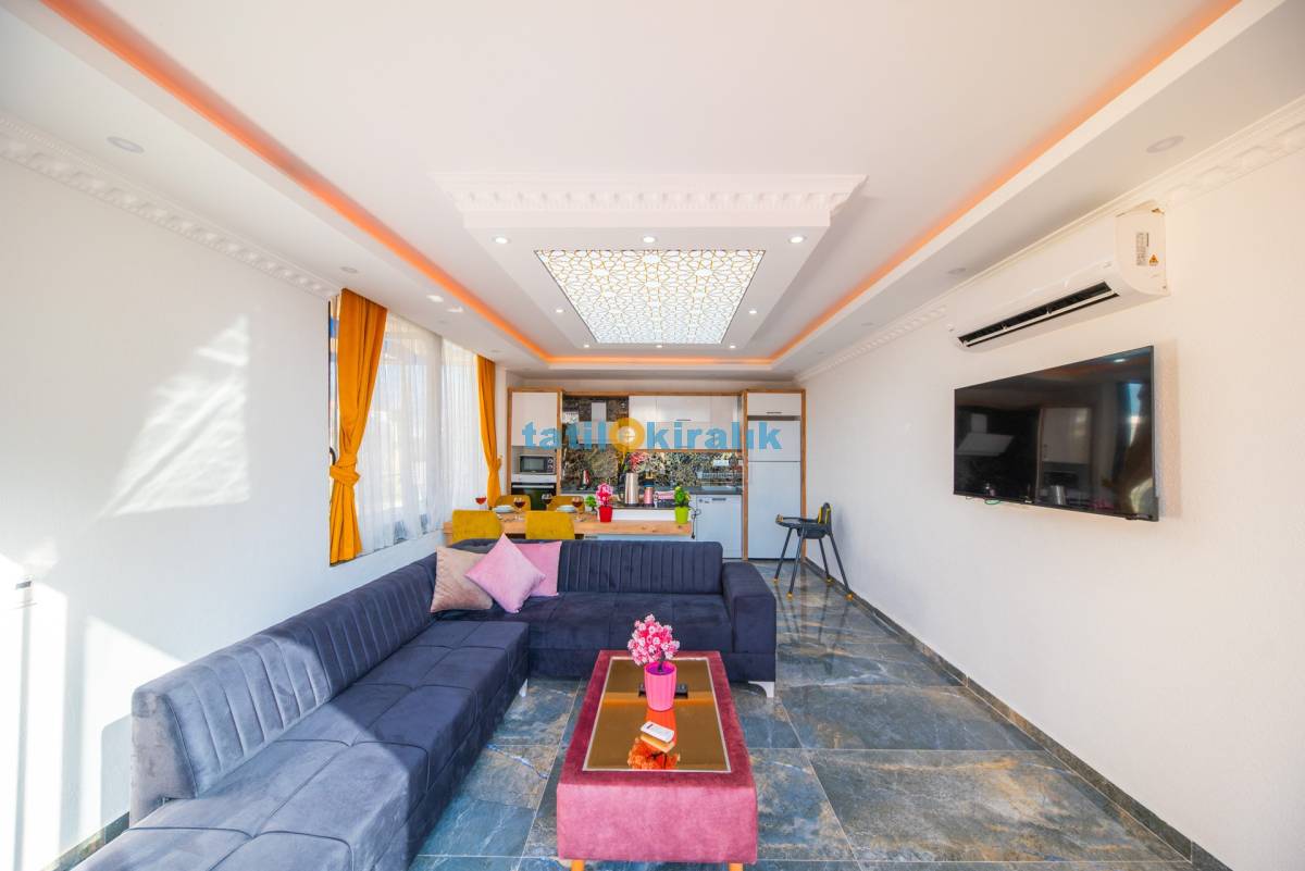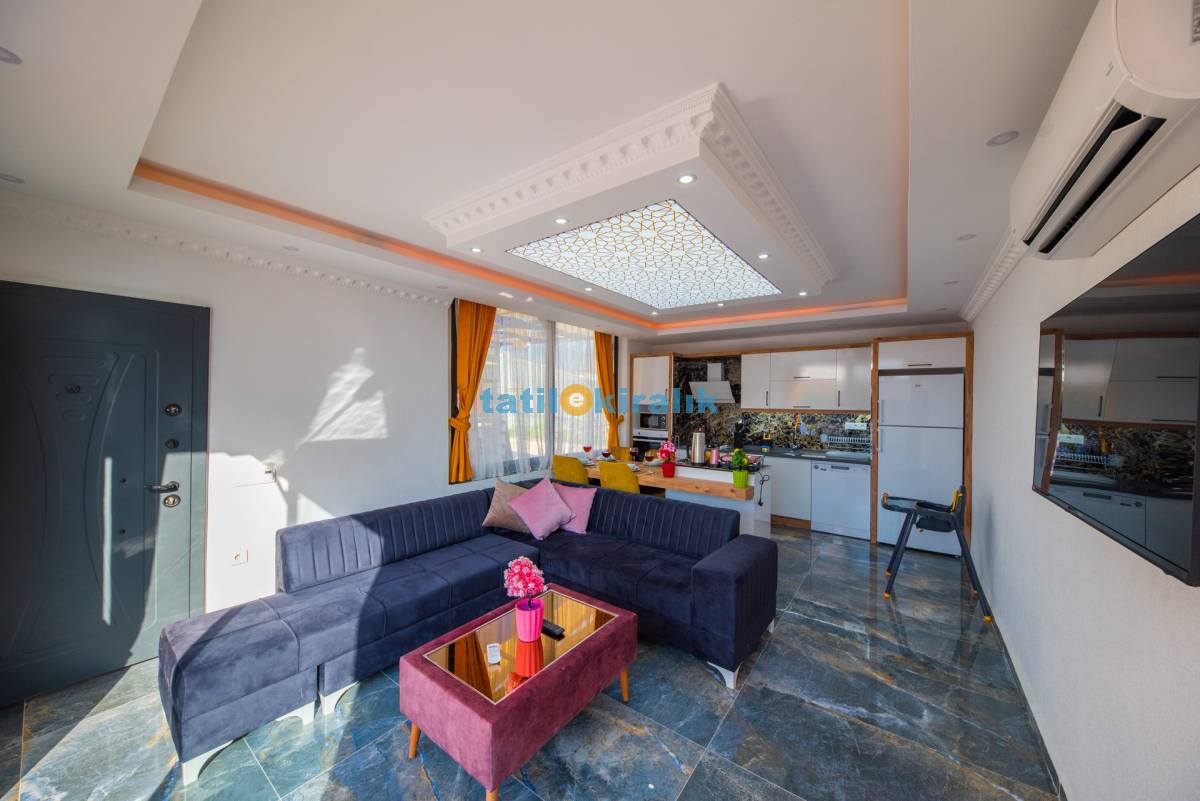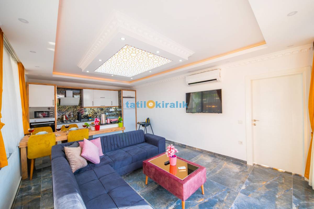 Salon Detayları: LCD TV, modern oturma grubu, yemek masası ve sandalyeler, kablosuz modem bulunmaktadır.
