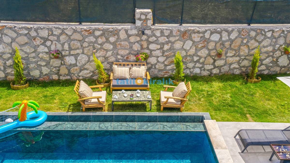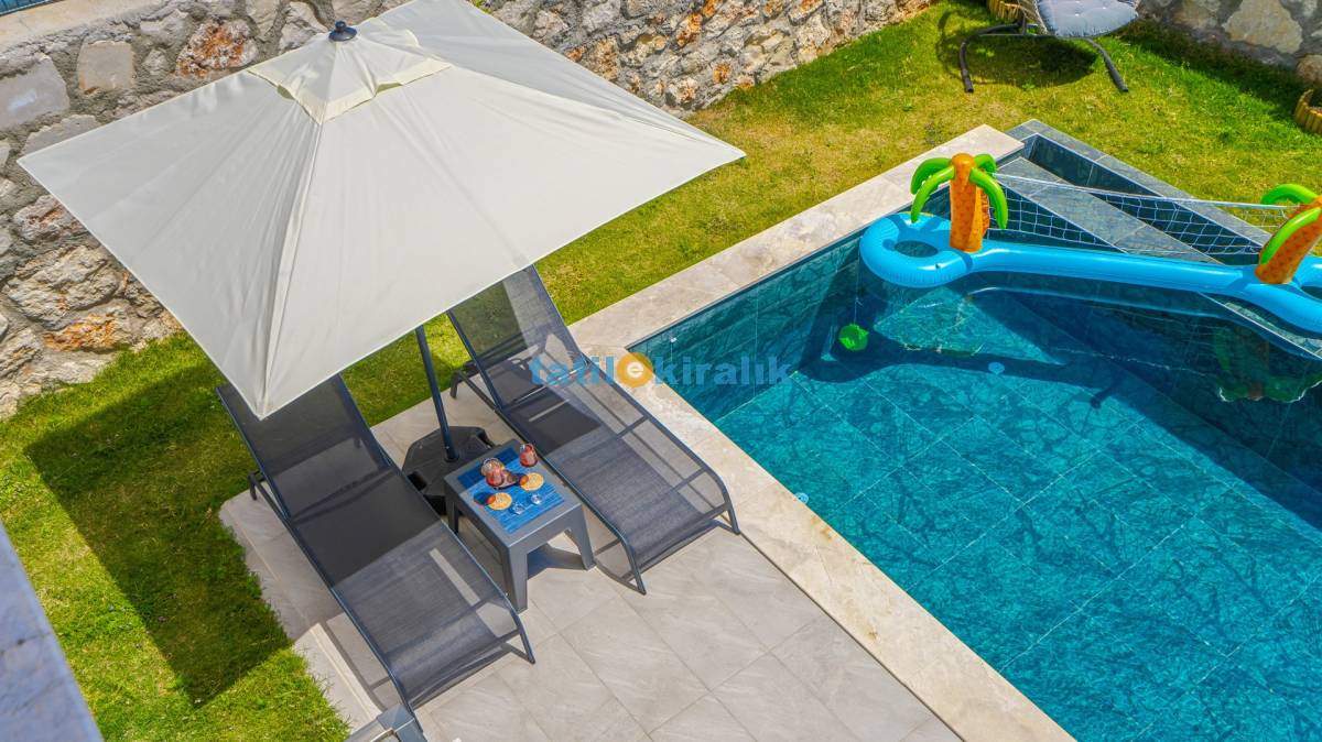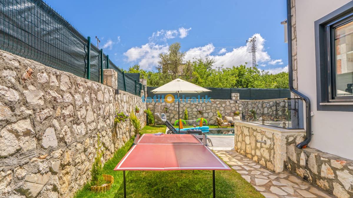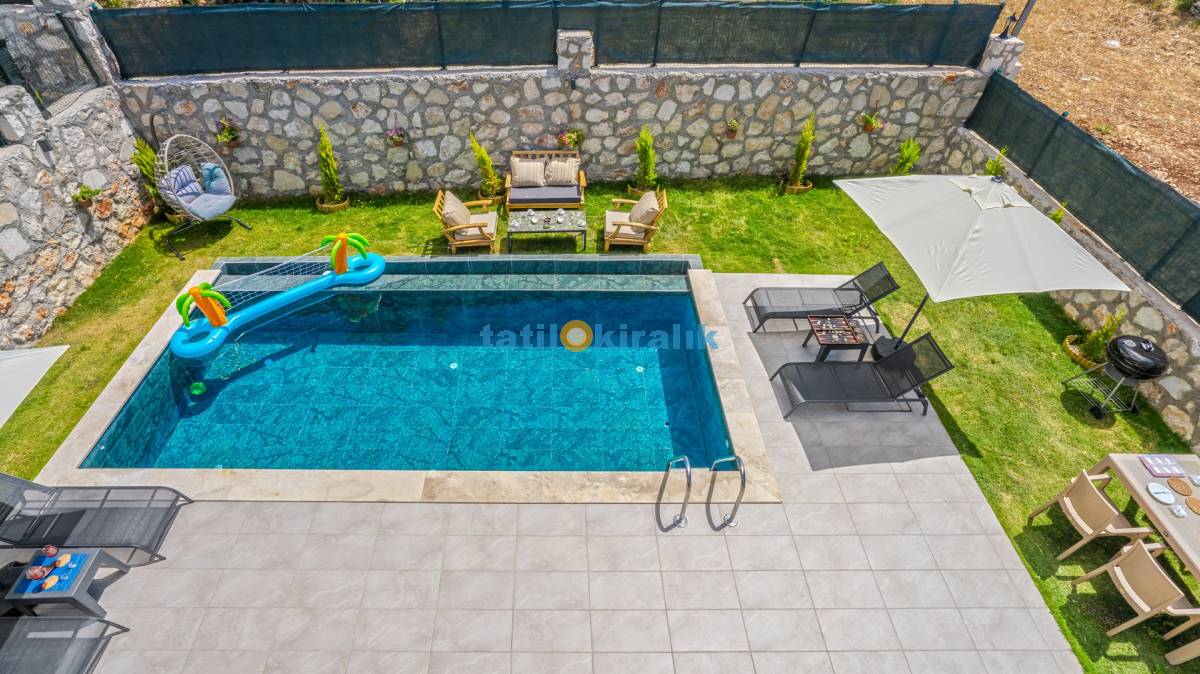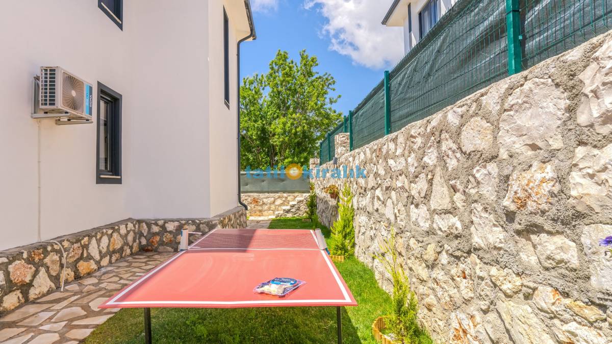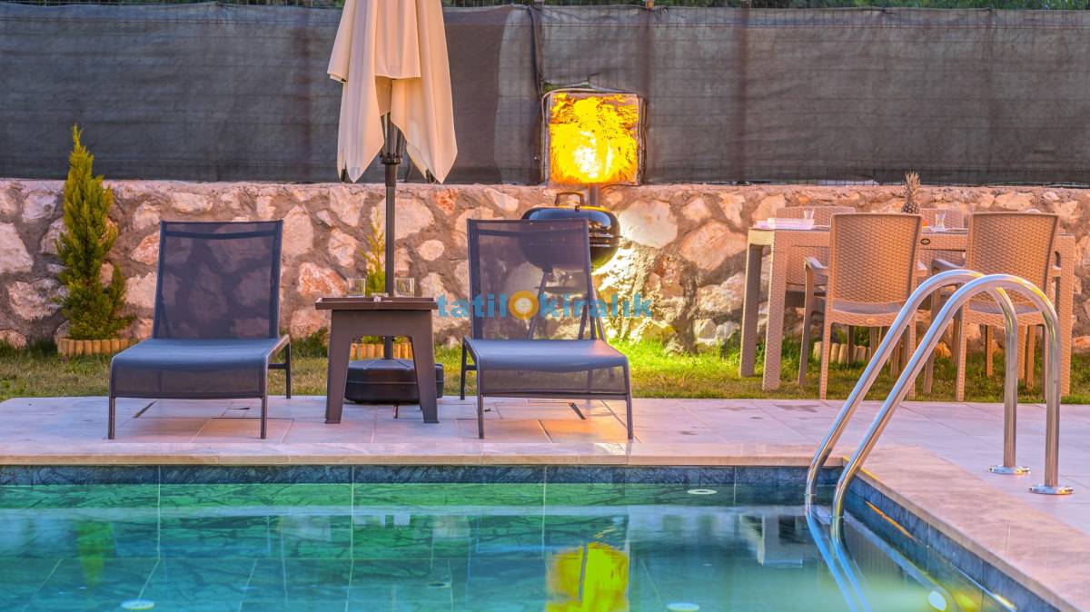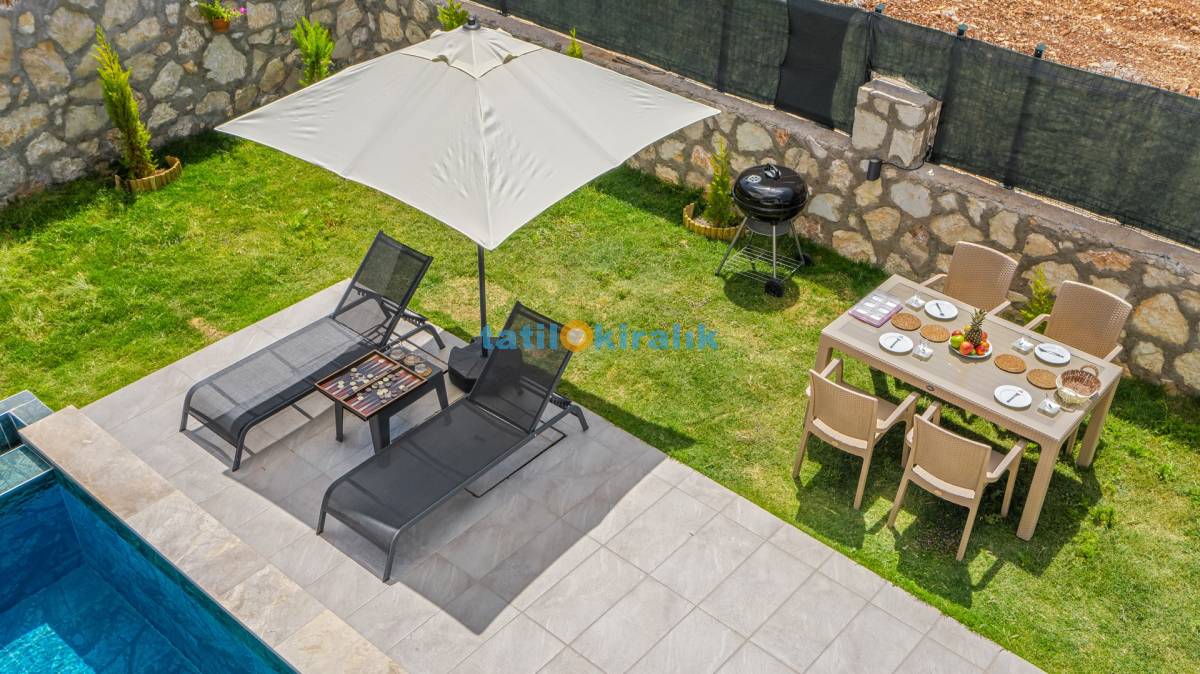 Havuz Terası Detayları : Şezlong, güneşlenme şemsiyesi, barbekü, salıncak, masa tenisi,  yemek masası ve sandalyeleri bulunmaktadır.