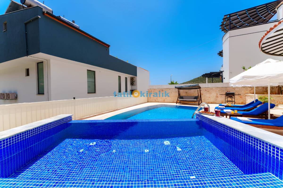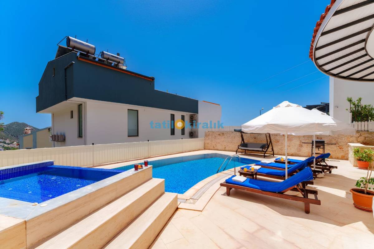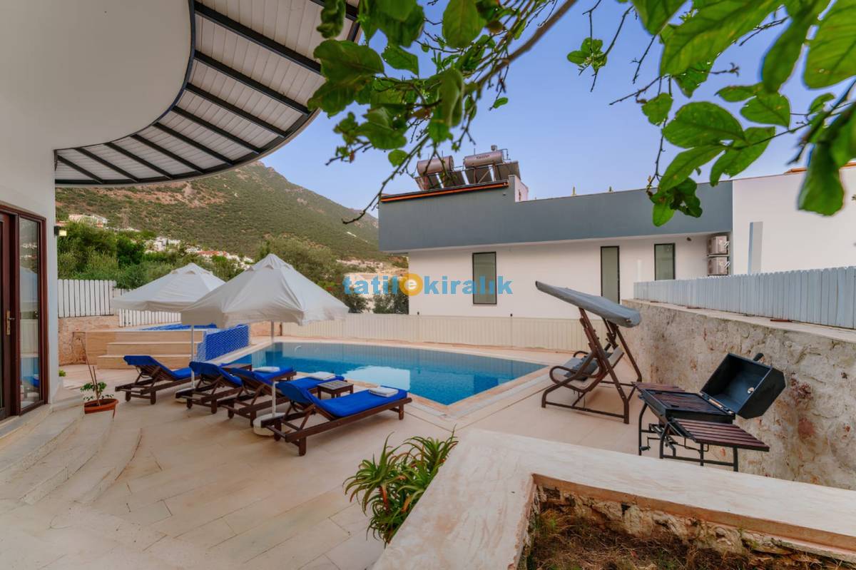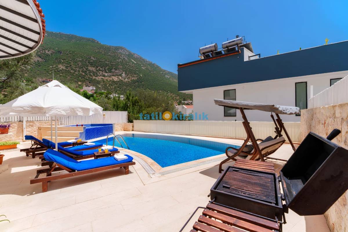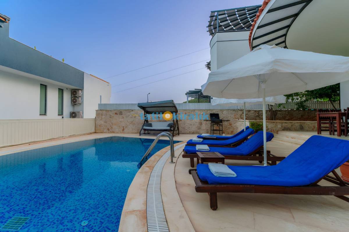 Havuz Terası Detayları: Şezlonglar , güneş şemsiyesi , mangal , salıncak , bahçe oturma takımı yer almaktadır.