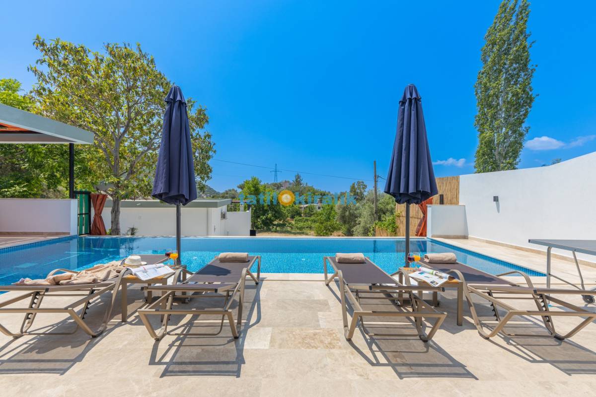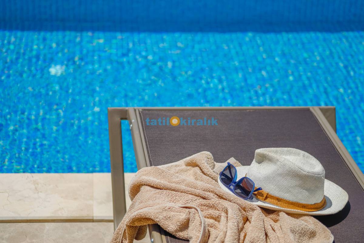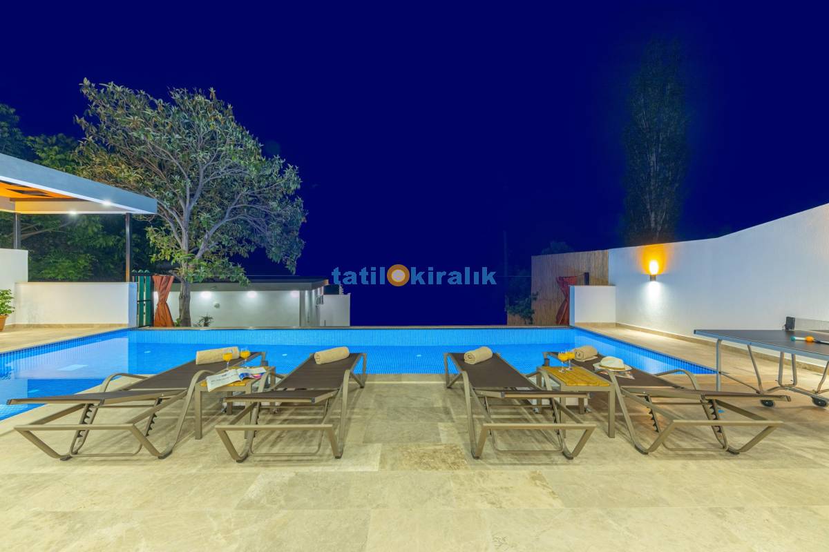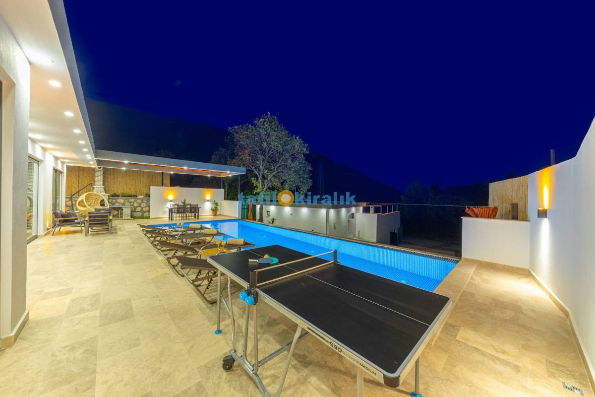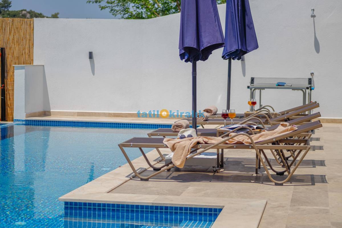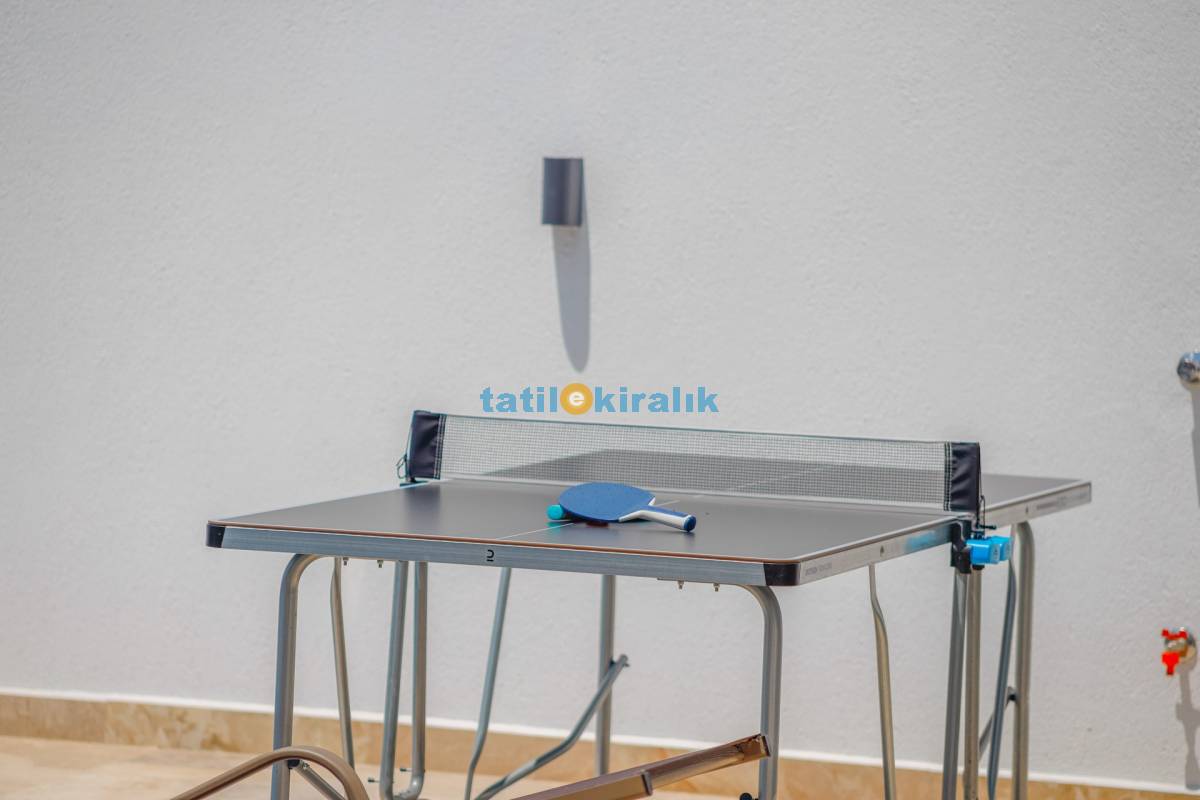 Havuz Terası Detayları : Şezlong, güneşlenme şemsiyesi, barbekü, masa tenisi, yemek masası ve sandalyeleri bulunmaktadır.