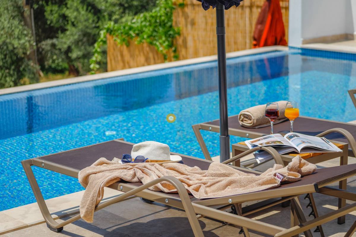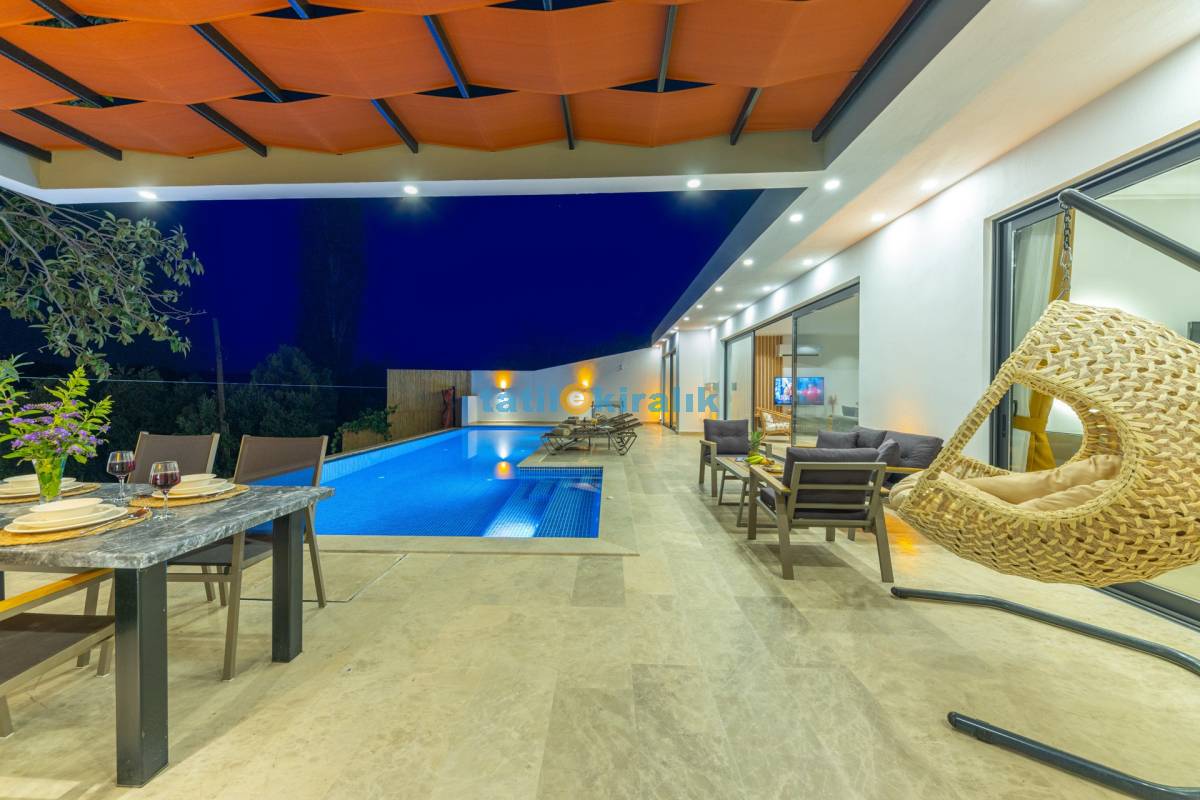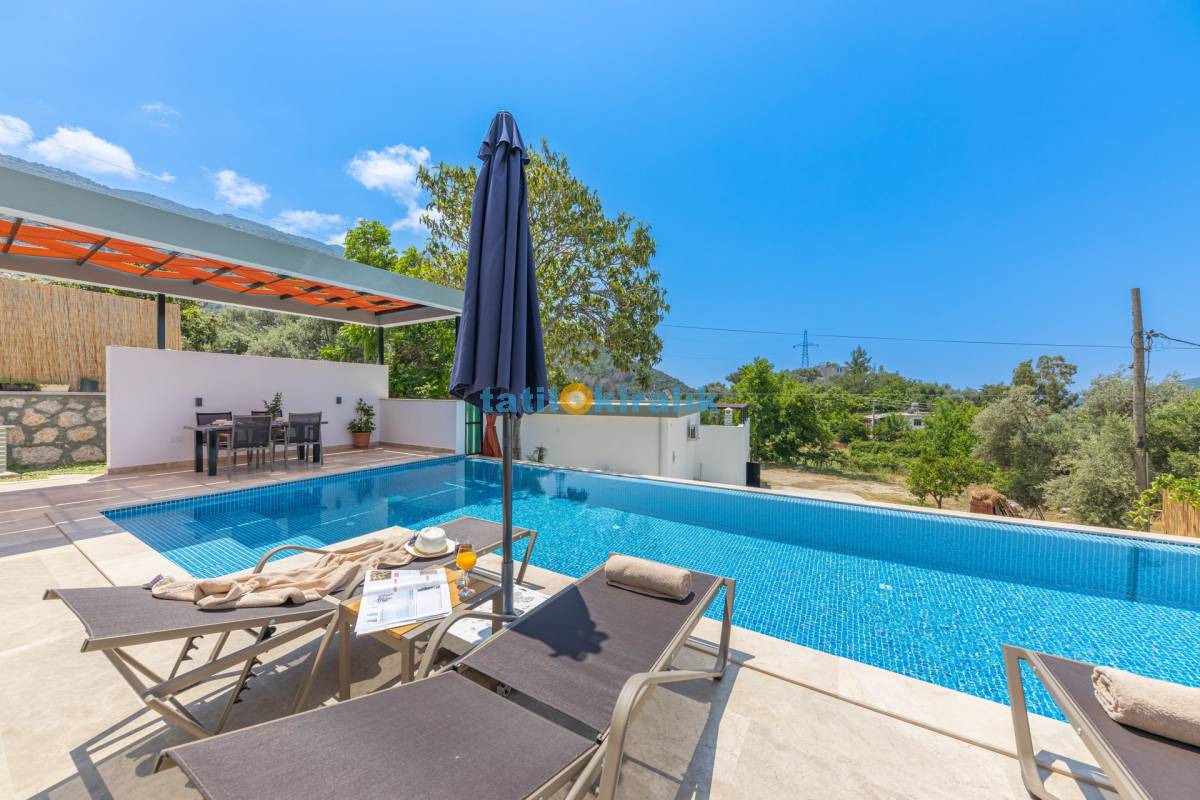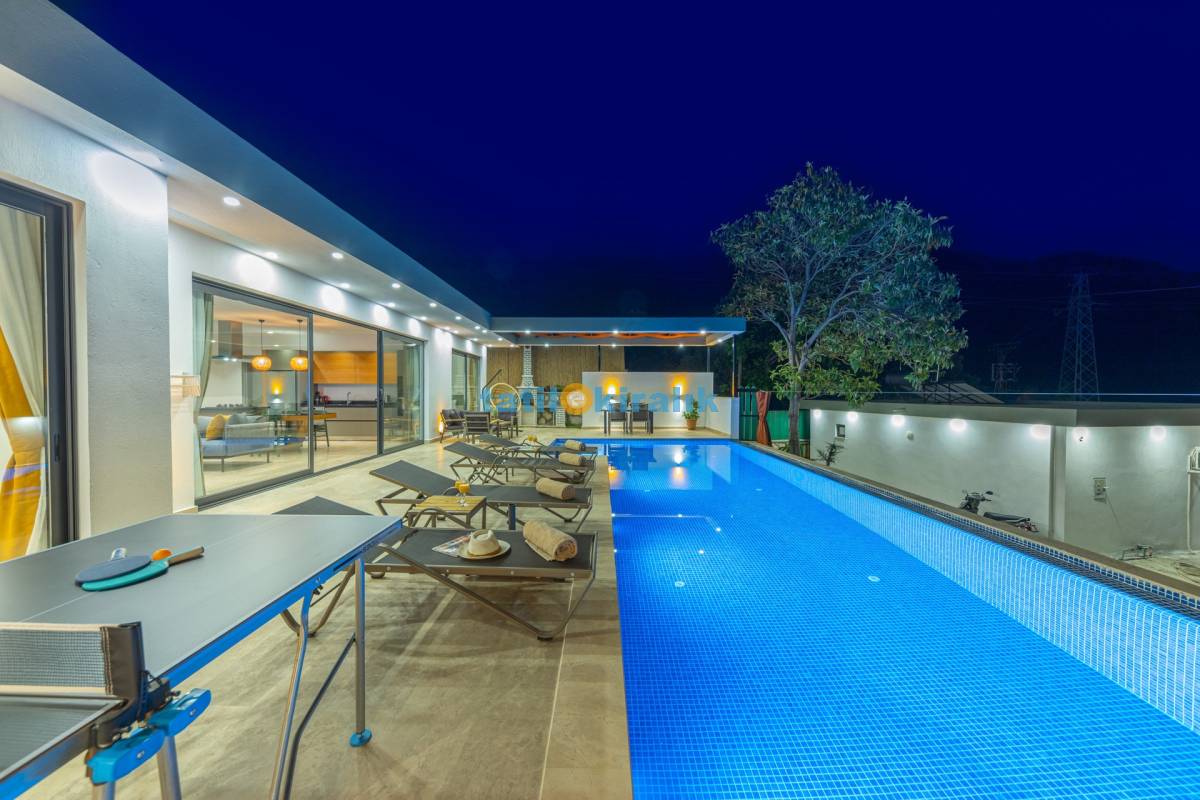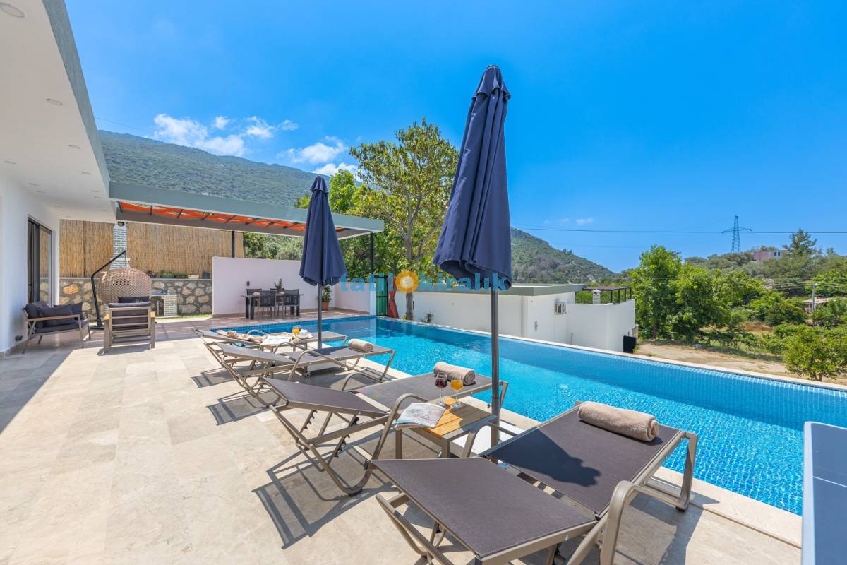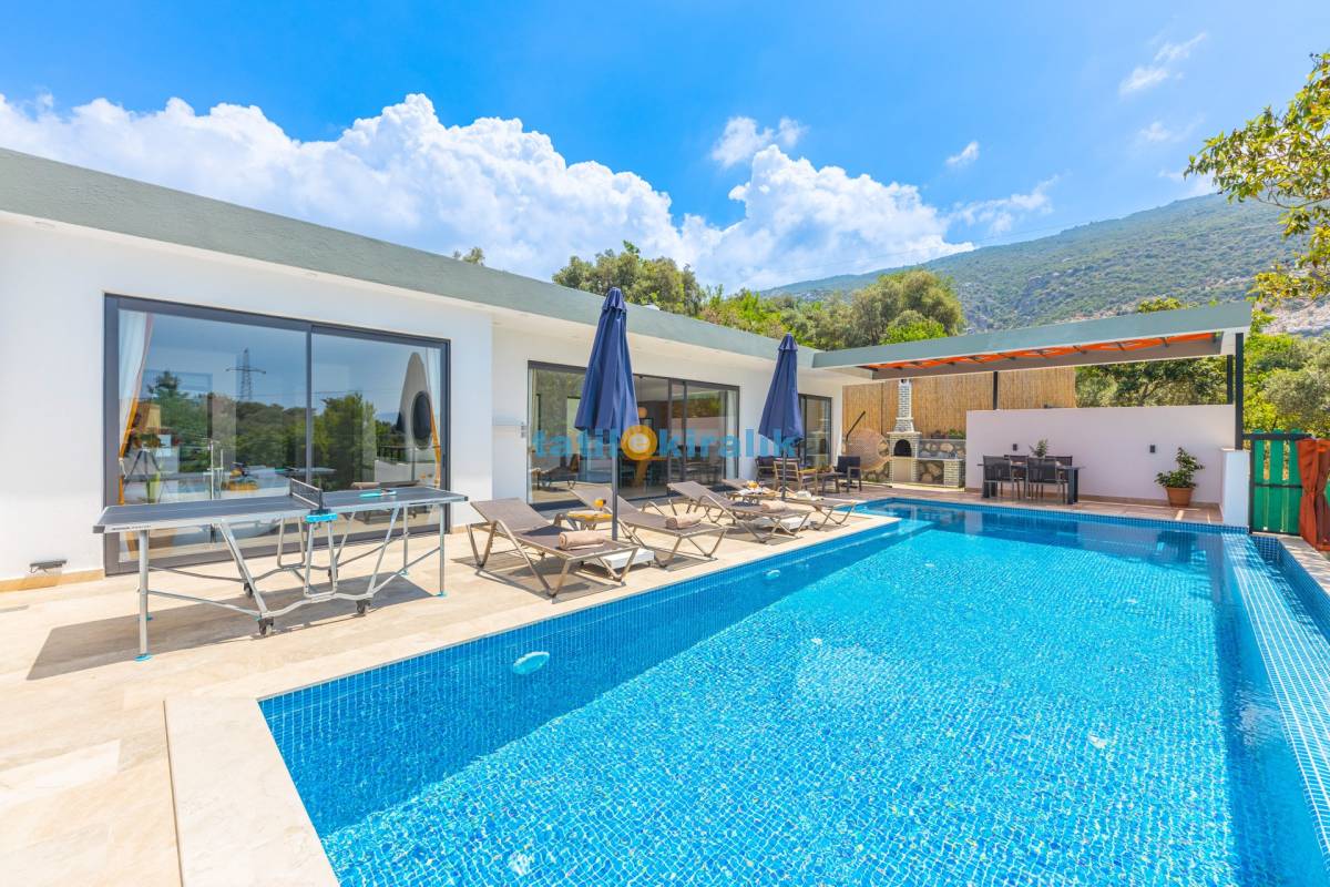Havuz Terası Detayları : Şezlong, güneşlenme şemsiyesi, barbekü, masa tenisi, yemek masası ve sandalyeleri bulunmaktadır.
