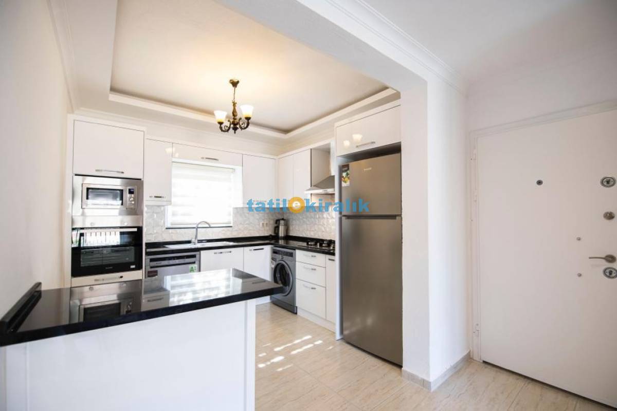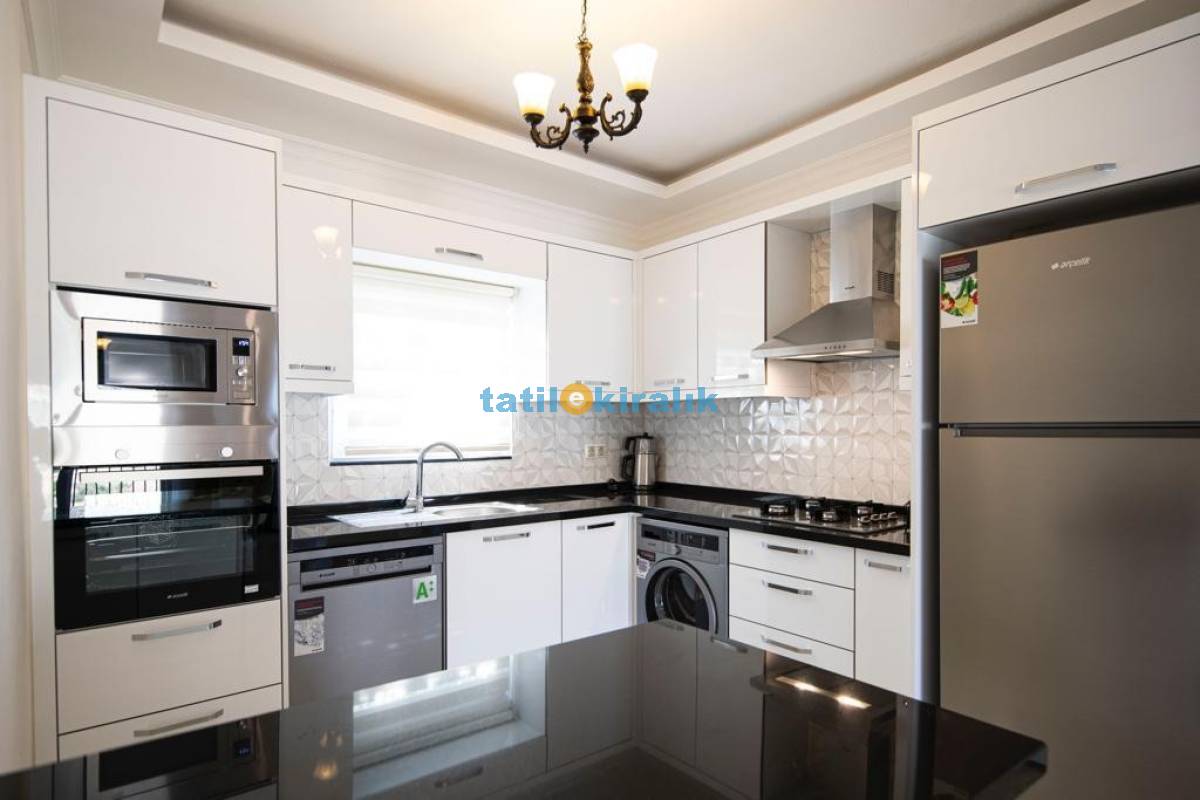 Mutfak Detayları : Buzdolabı , bulaşık makinesi , fırın , çamaşır makinesi, 4 kişilik yemek takımı, tava-tencere, çatal-bıçak seti bulunmaktadır.