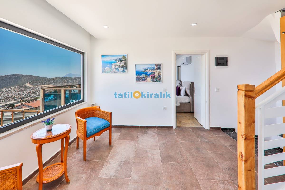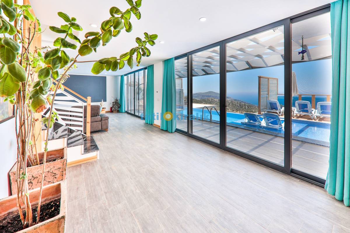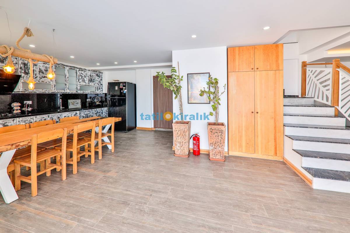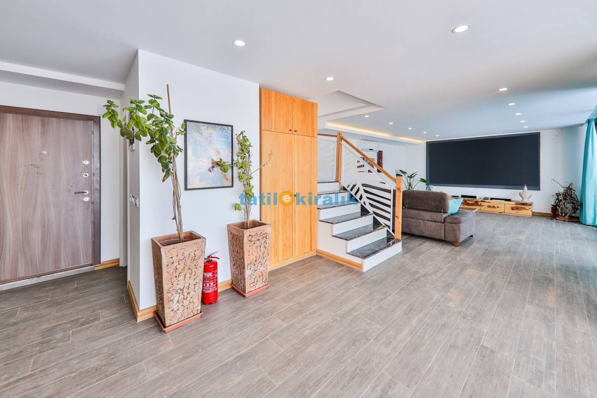 Salon Detayları: Modern oturma grubu, projeksiyon perde sistemi, kablosuz internet, klima ve havuz terasına çıkış bulunmaktadır.