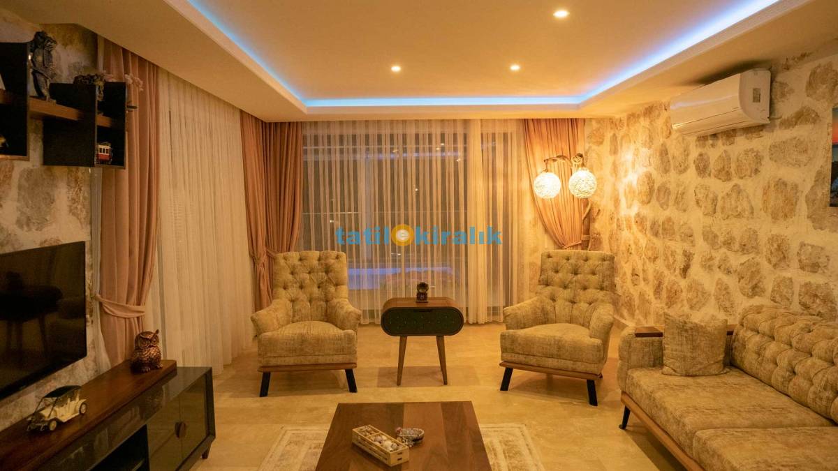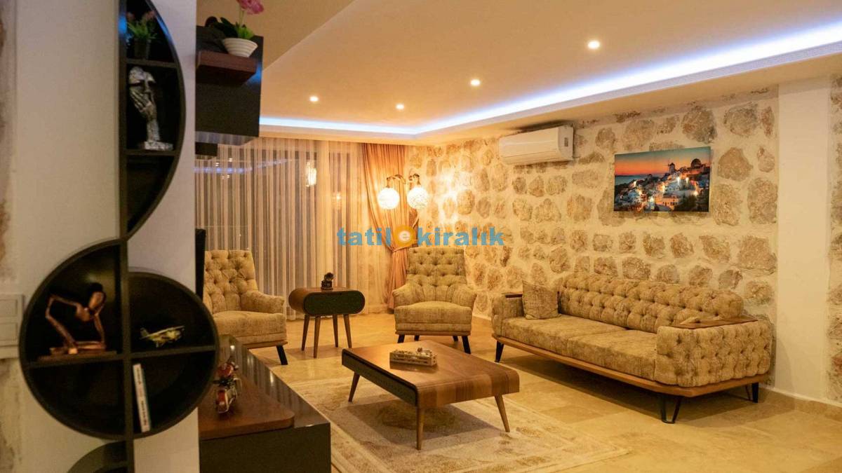 Salon Detayları : Klima, televizyon, internet, uydu alıcı, oturma grubu ve yemek masası bulunmaktadır. Salondan havuza açılan bir çıkışımız mevcuttur..