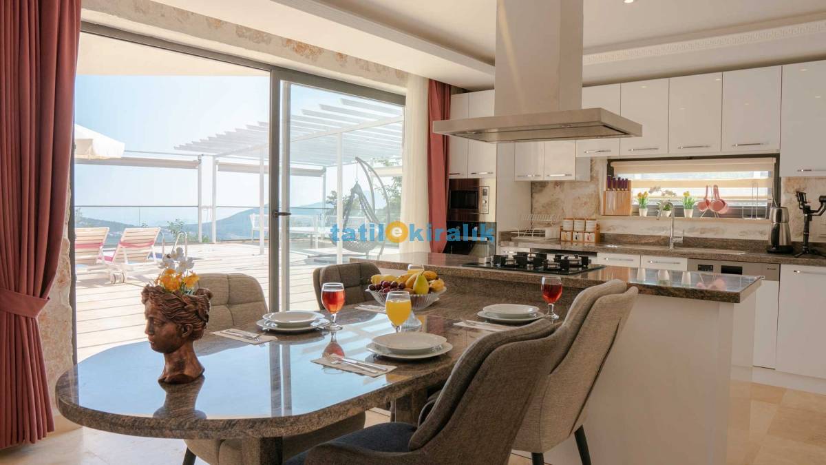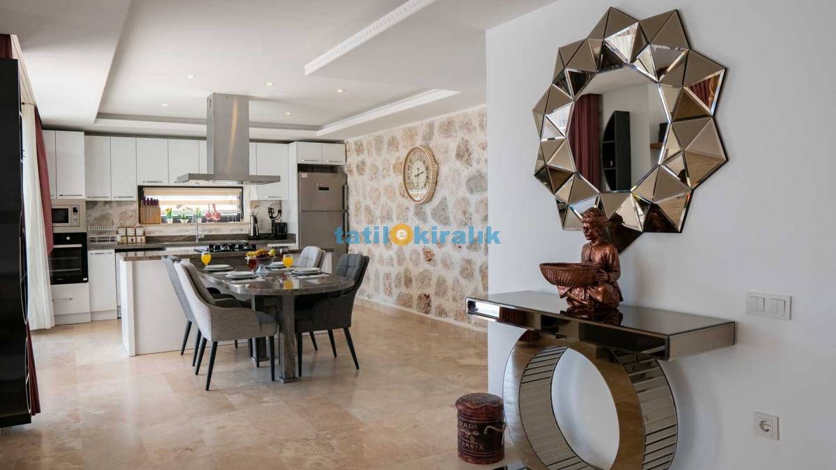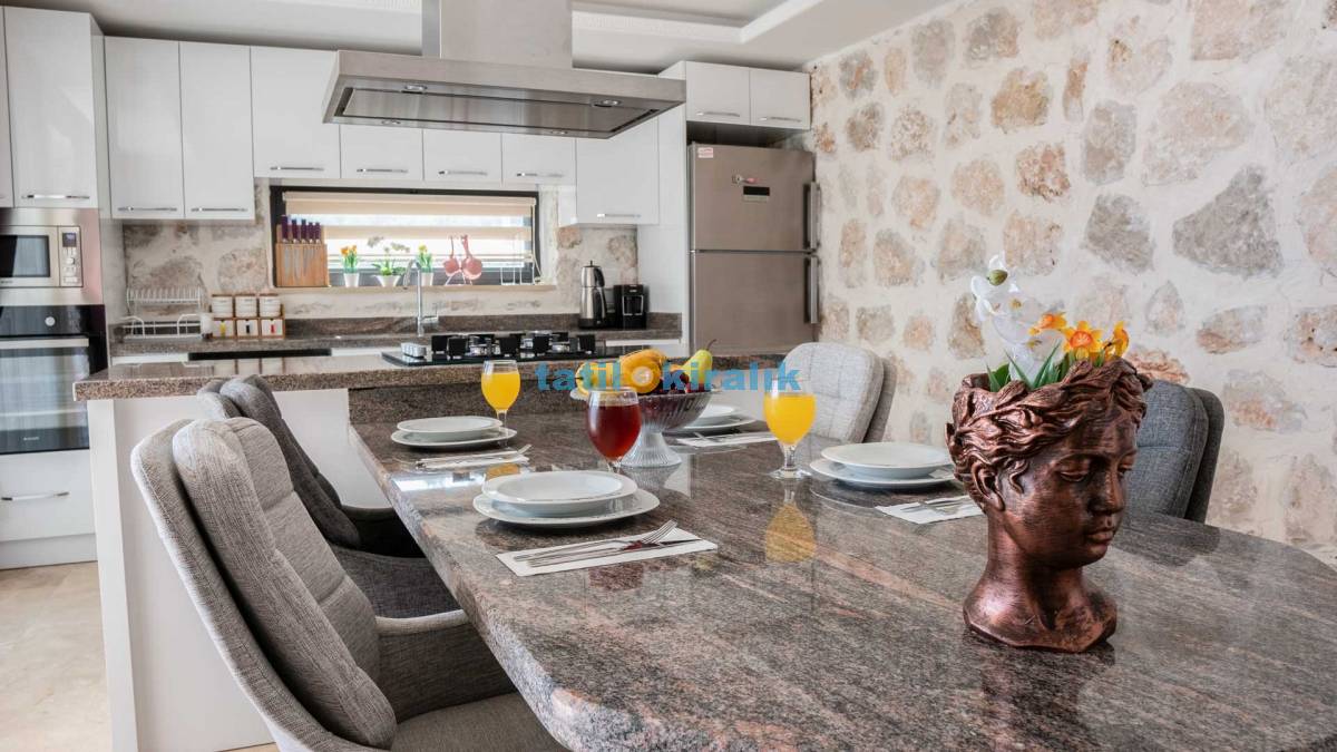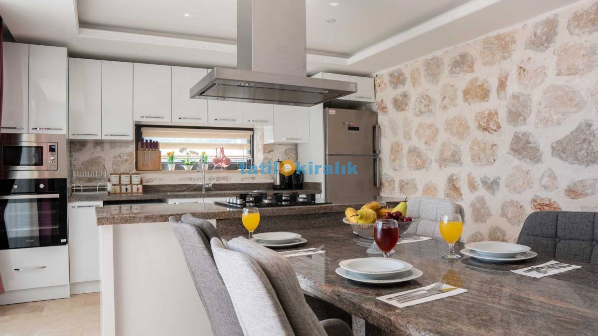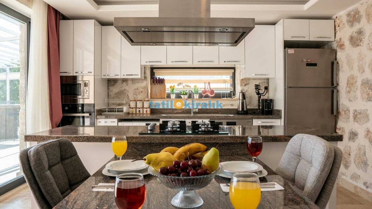 Detayları: Bulaşık makinesi, buzdolabı, elektrikli su ısıtıcı kettle, çamaşır makinesi, fırın, 4’lü ocak, 4 kişilik yemek takımı, mikrodalga, kaşık, bıçak, çatal takımı, tencere, bardaklar ve tava takımı bulunmaktadır. Mutfaktan bahçeye çıkışımız mevcuttur.