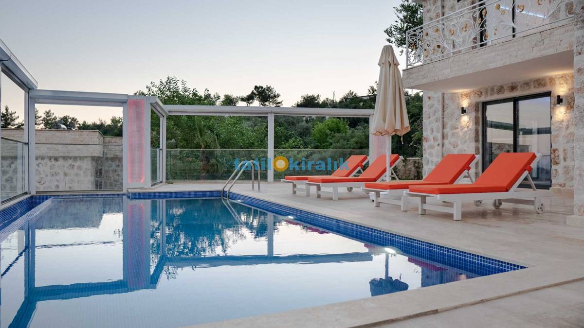 Detayları : Havuz, masa ve sandalyeler, şezlong, güneşten korunmak için şemsiye ve barbekü yer almaktadır.