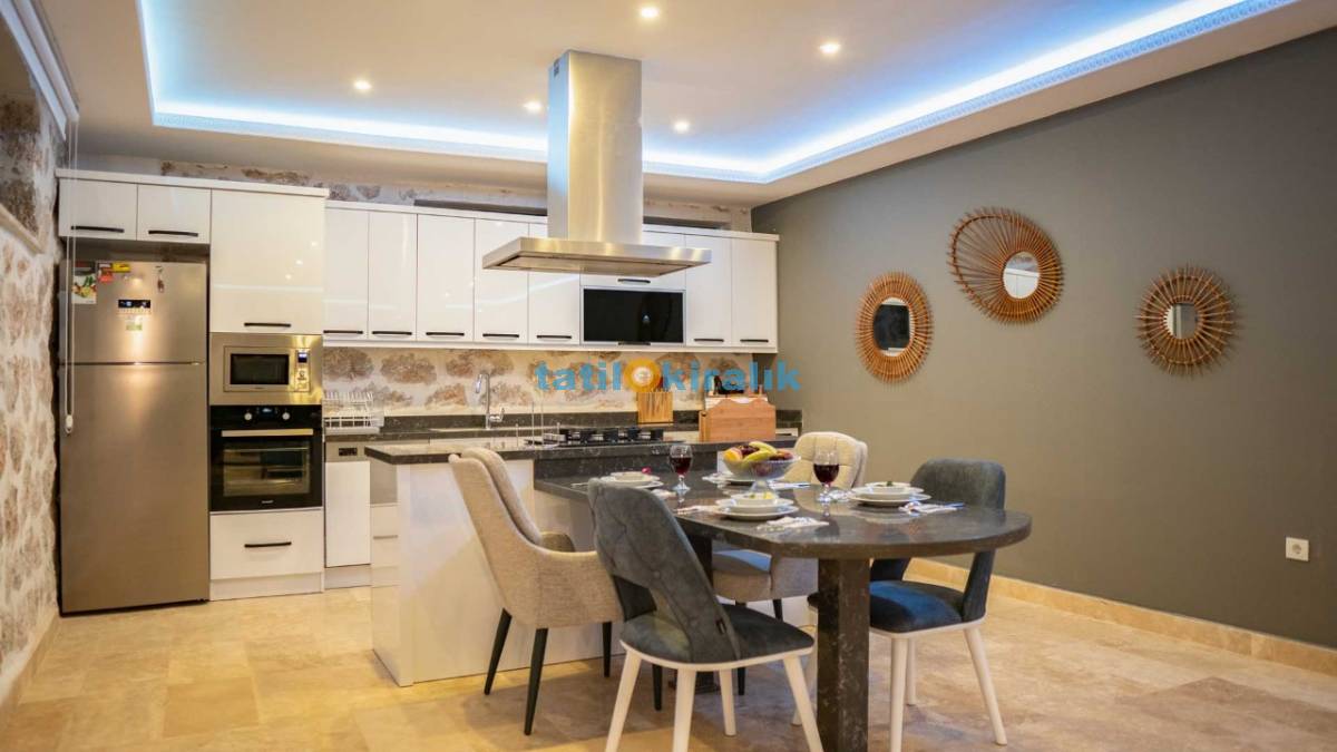 Detayları: Bulaşık makinesi, buzdolabı, elektrikli su ısıtıcı kettle, çamaşır makinesi, fırın, 4’lü ocak, 4 kişilik yemek takımı, mikrodalga, kaşık, bıçak, çatal takımı, tencere, bardaklar ve tava takımı bulunmaktadır. Mutfaktan bahçeye ve havuza çıkışımız mevcuttur.