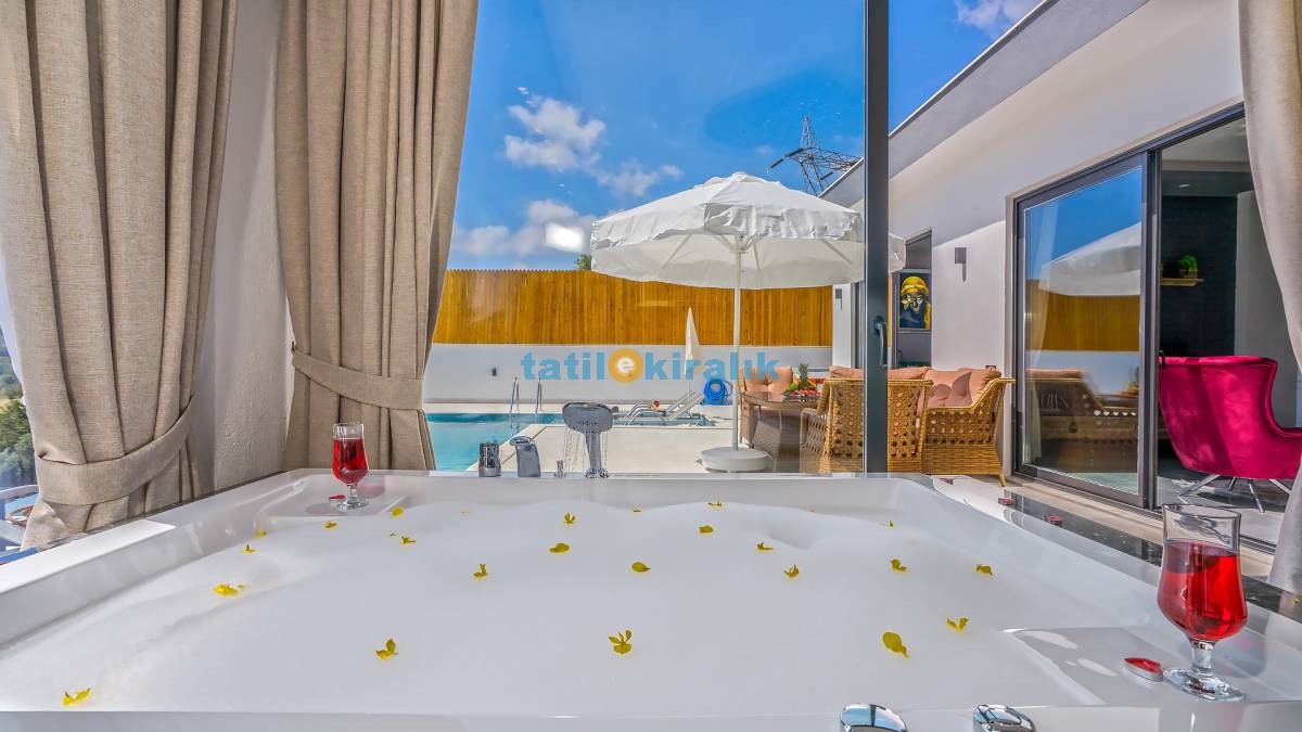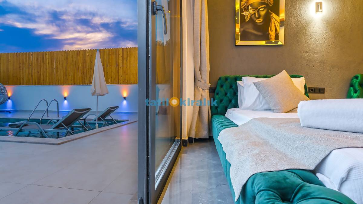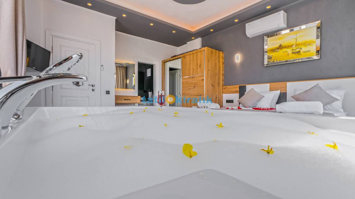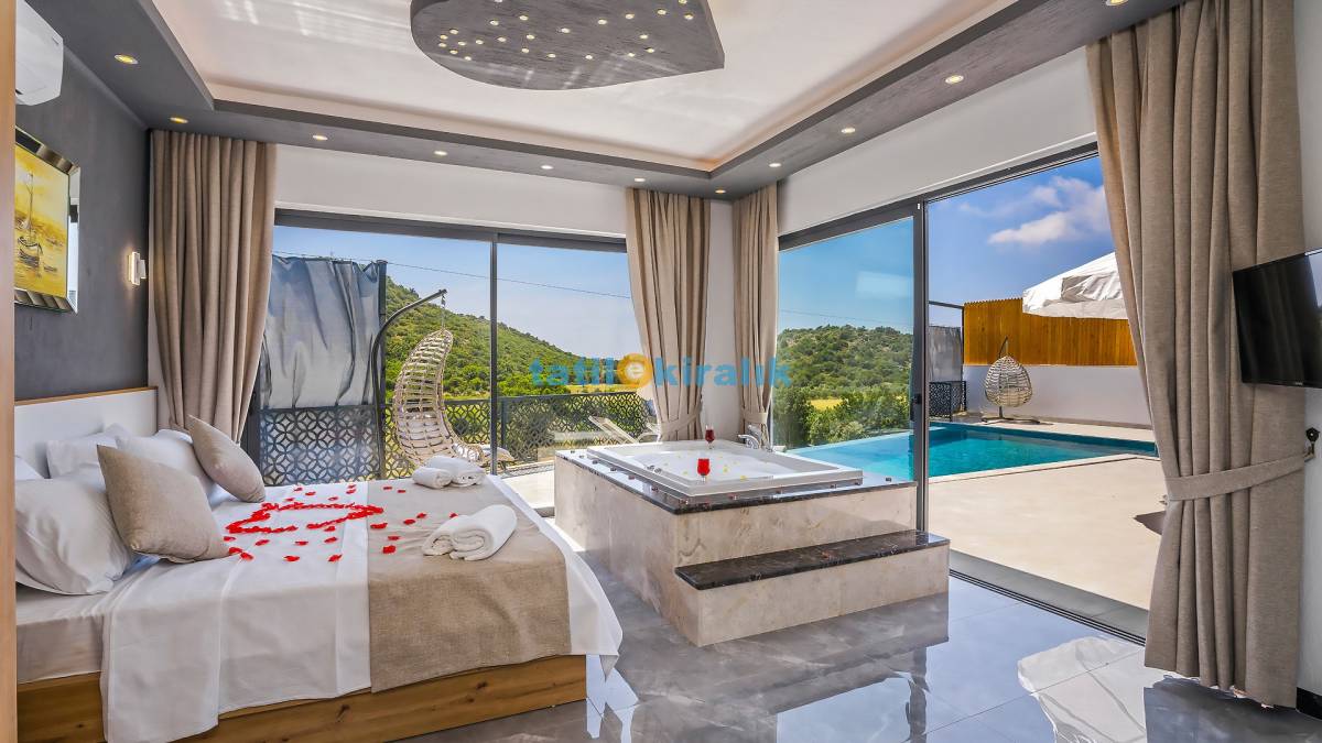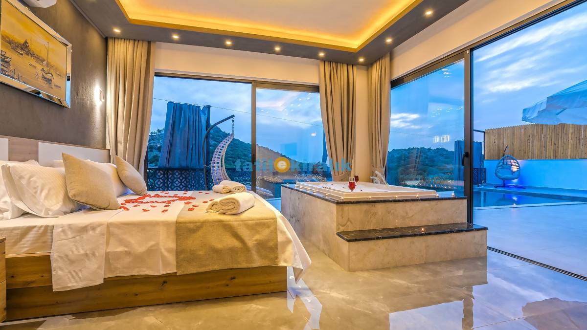 Detayları : Çift kişilik yatak, klima, elbise dolabı, makyaj masası, jakuzi, TV, komodin, ısıtmalı havuz, lavabo ve banyo bulunmaktadır.