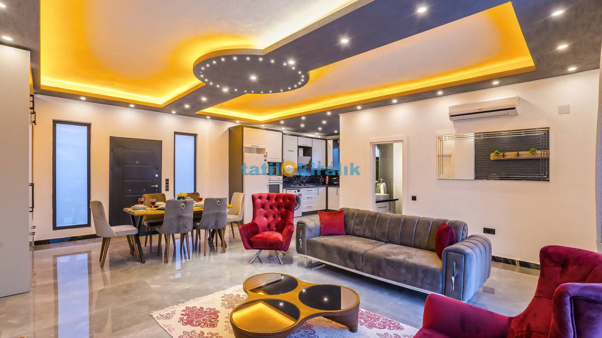 Salon Detayları: Oturma grubu, klima, TV, yemek masası bulunmaktadır.