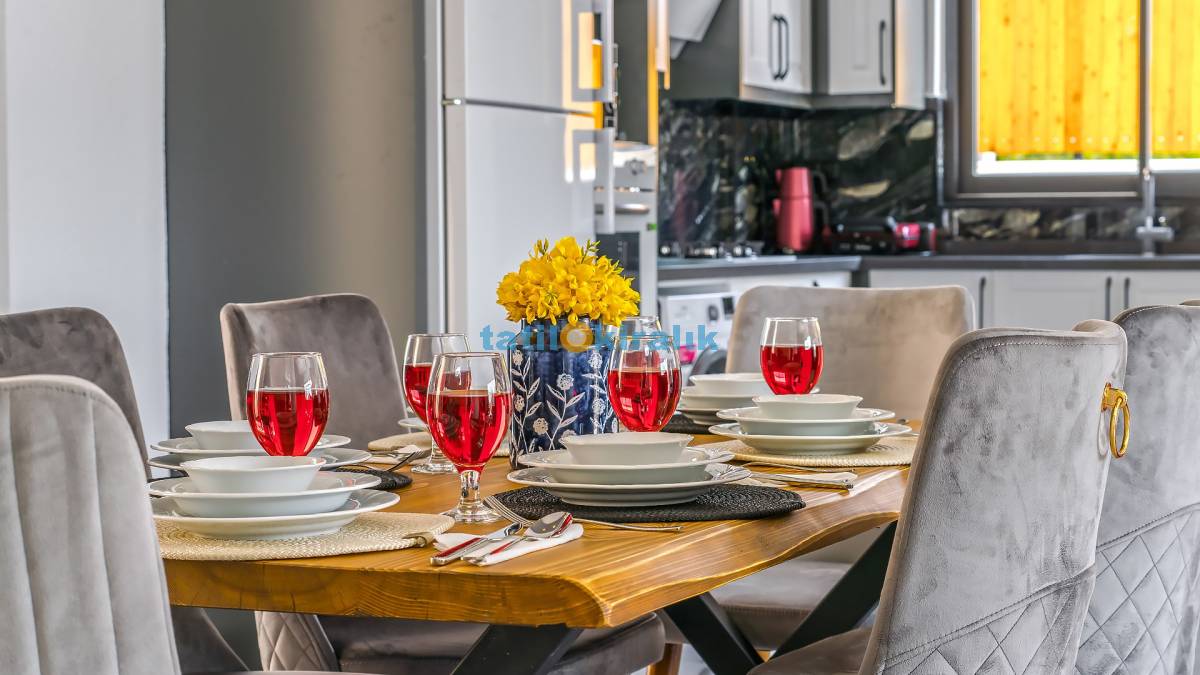 Mutfak Detayları: Buzdolabı, Bulaşık makinesi, Mikrodalga fırın, Elektrikli su ısıtıcısı, tost makinesi, Fırın, 4’lü ocak, yemek takımı, Tava, Tencereler, çatal, bıçak vb. bulunmaktadır.