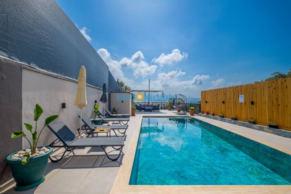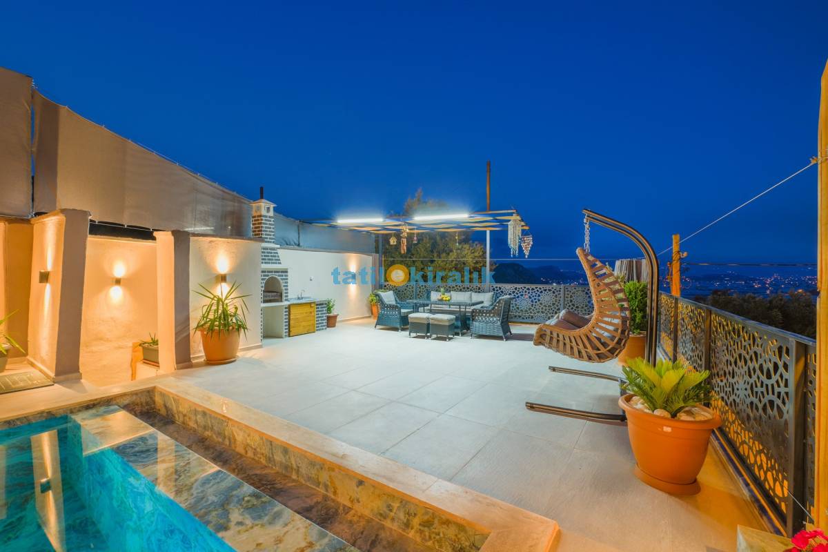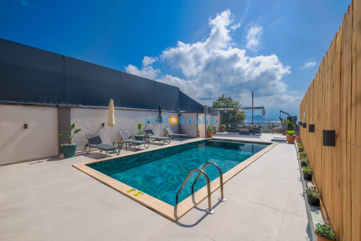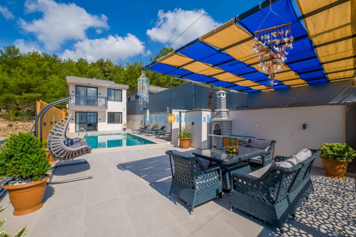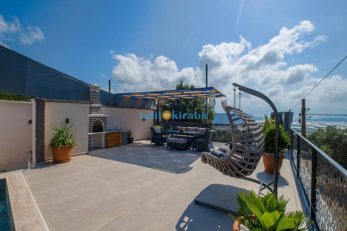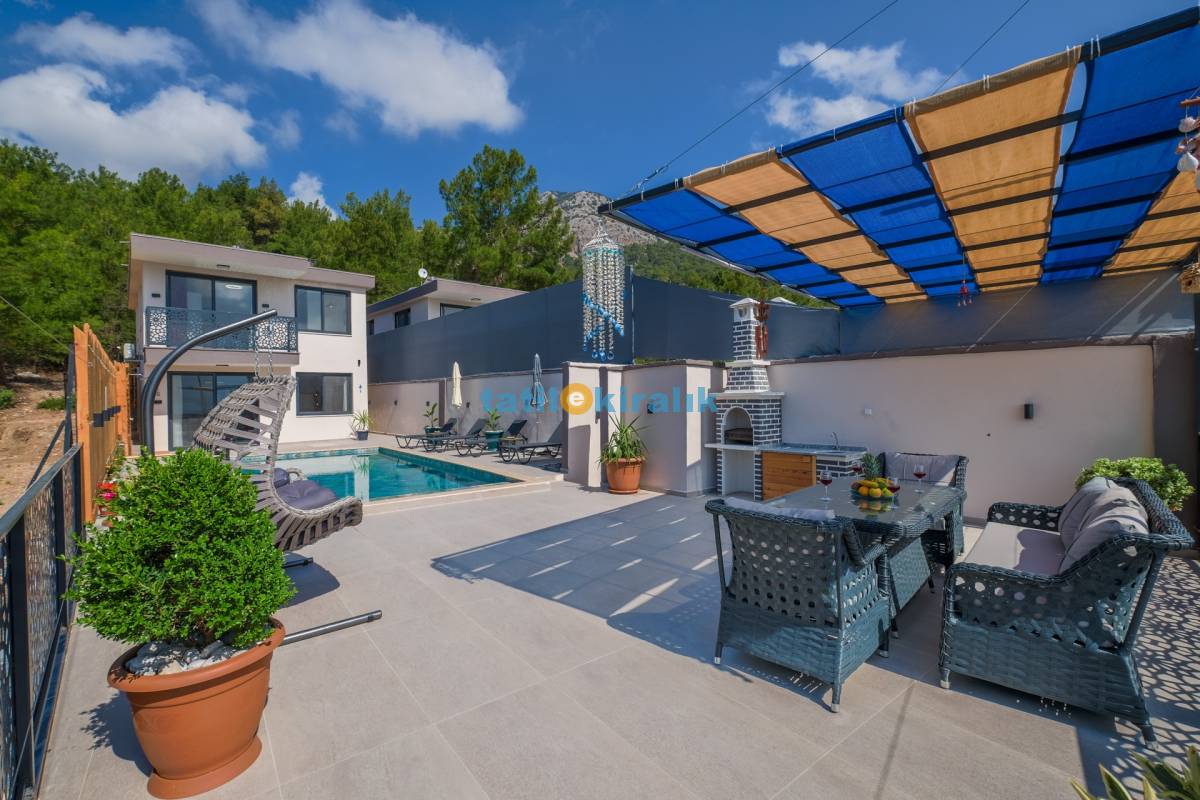 Havuz Terası Detayları: Şezlong, güneşlenme şemsiyesi, barbekü, salıncak, yemek masası ve sandalyeleri bulunmaktadır.