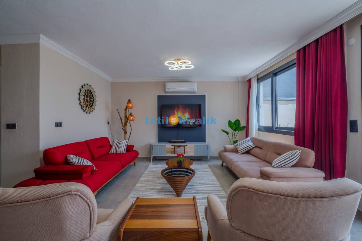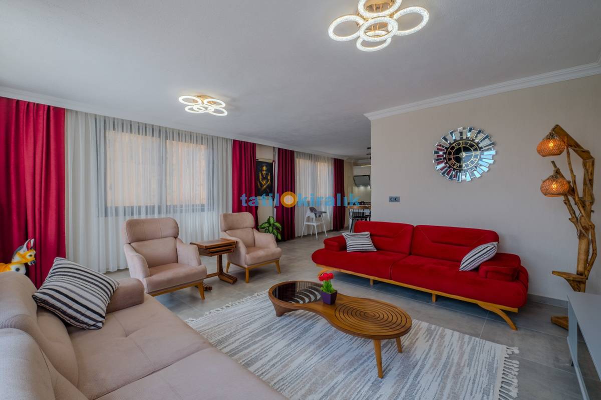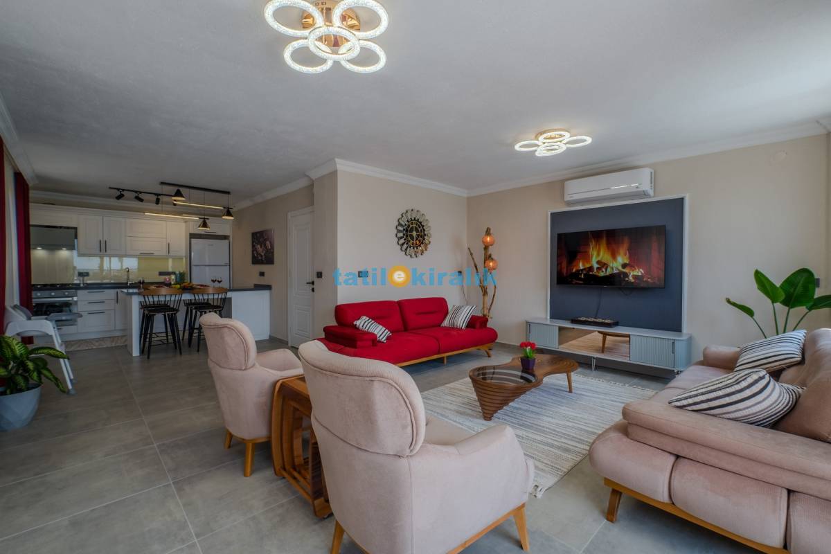 Salon Detayları: LCD TV, modern oturma grubu, yemek masası ve sandalyeler, kablosuz modem bulunmaktadır.