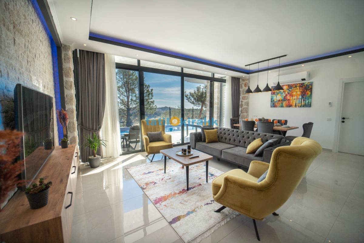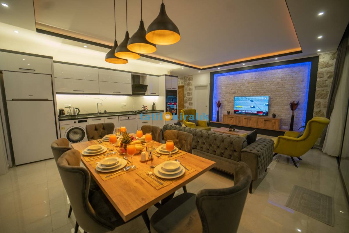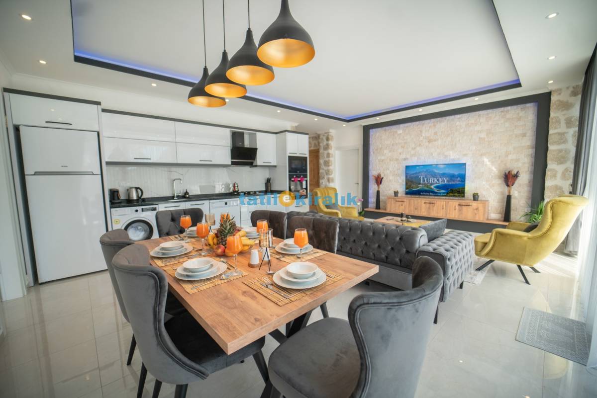 Salon Detayları: TV, modern oturma grubu, yemek masası, klima bulunmaktadır.