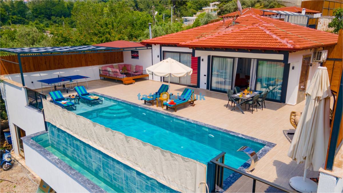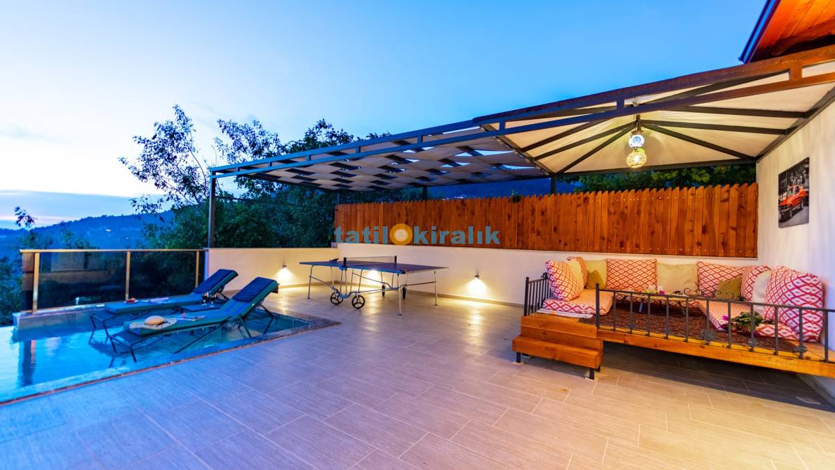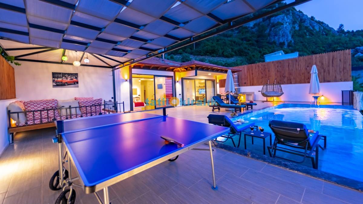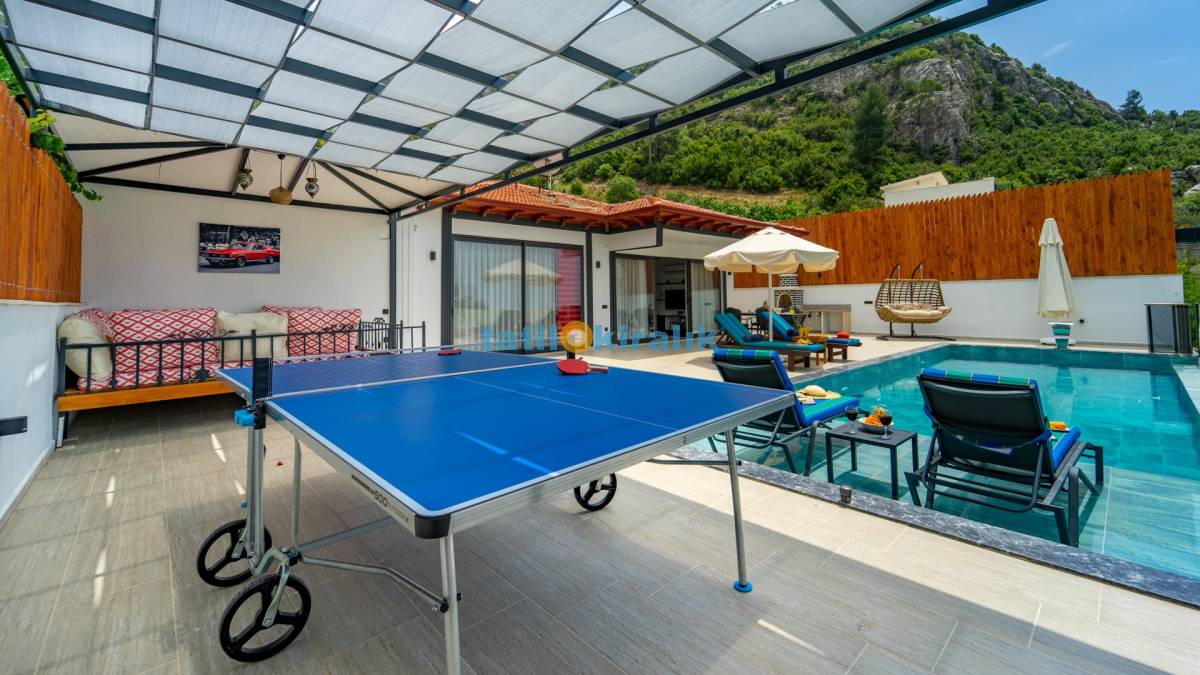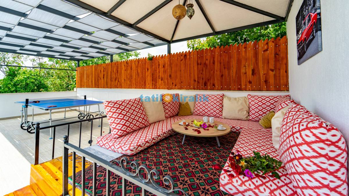 Detayları : Şezlong , güneşlenme şemsiyesi , salıncak , Masa tenisi , barbekü , yemek masası ve sandalyeleri bulunmaktadır.