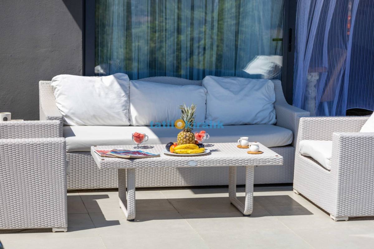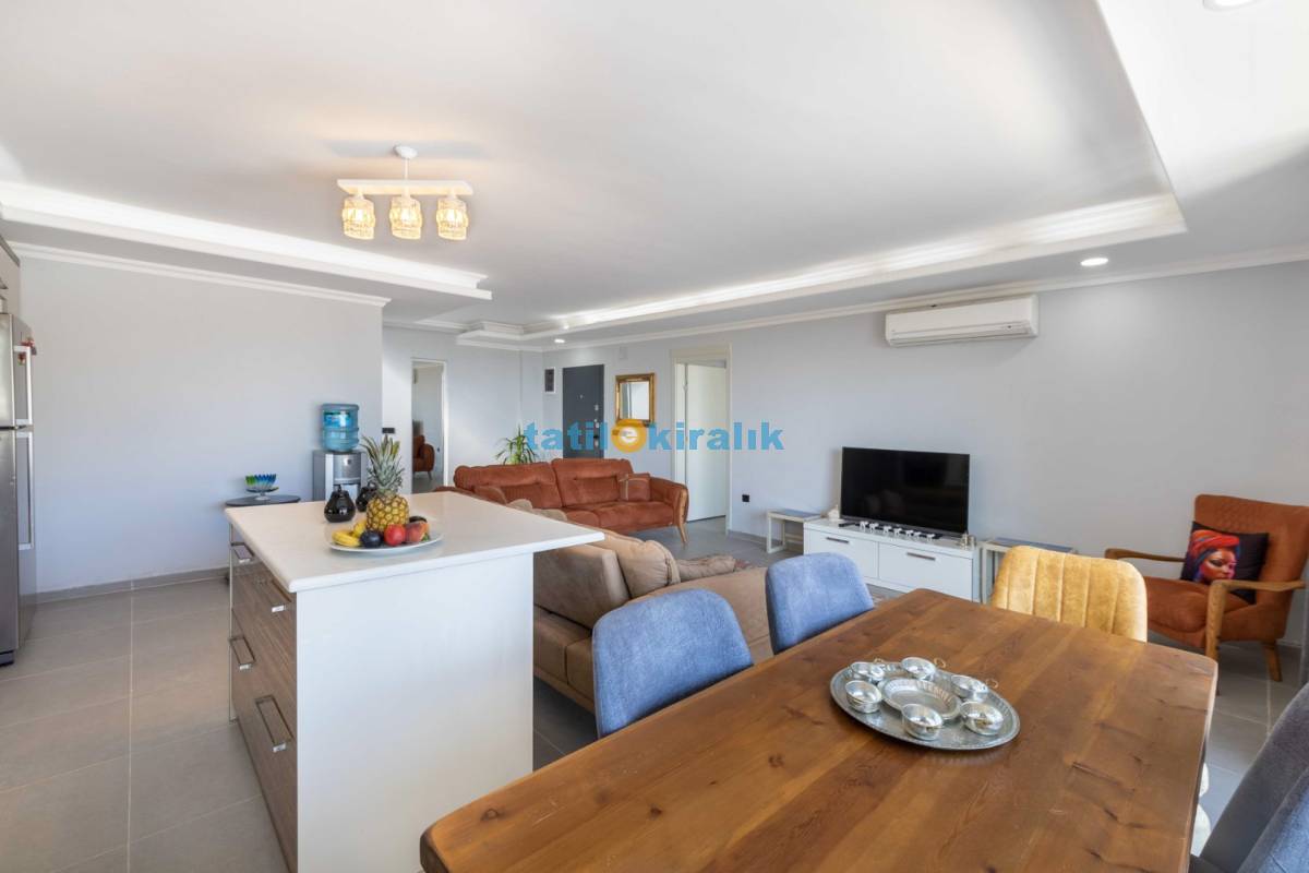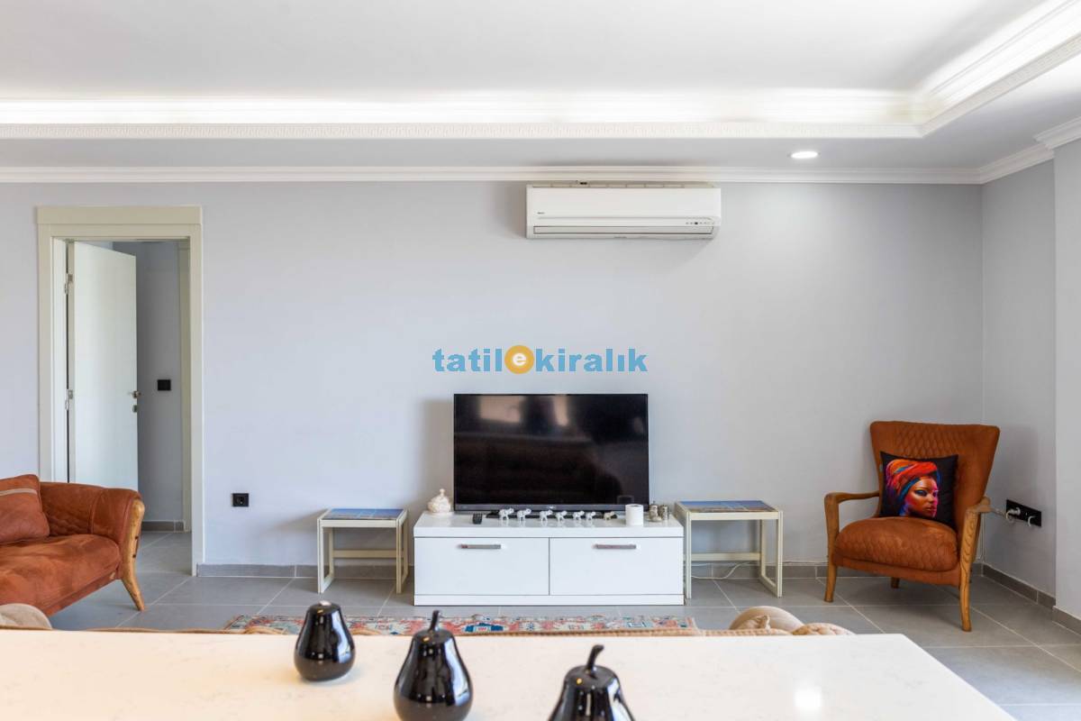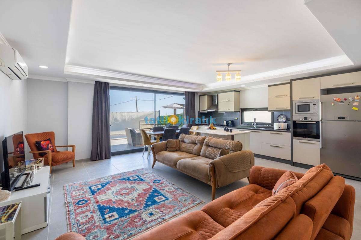 Salon Detayları: LCD TV, modern oturma grubu, yemek masası ve sandalyeler, kablosuz modem bulunmaktadır.