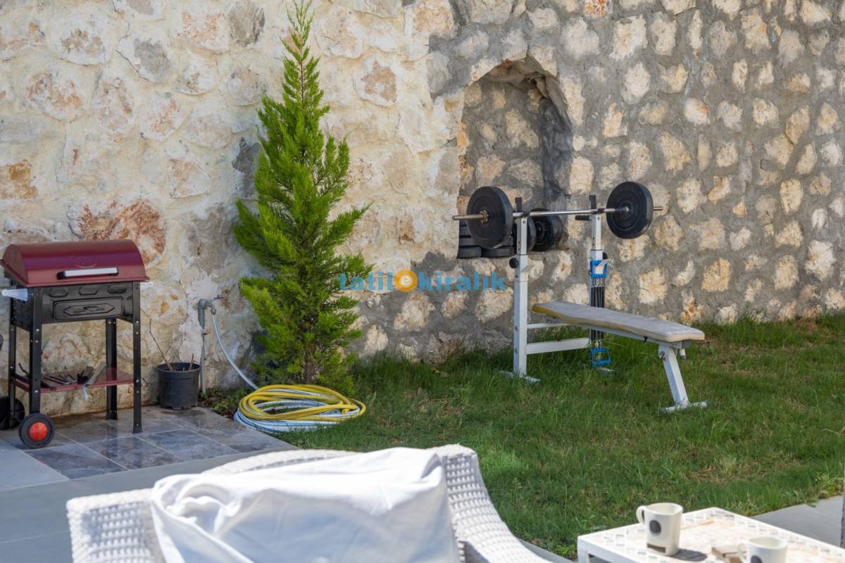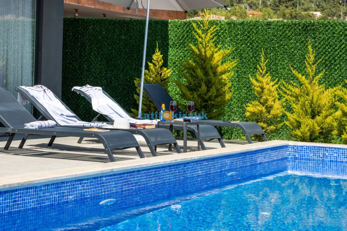 Havuz Terası Detayları : Şezlong, güneşlenme şemşiyesi, mangal, oturma grubu, yemek masası ve sandalyeleri bulunmaktadır.
