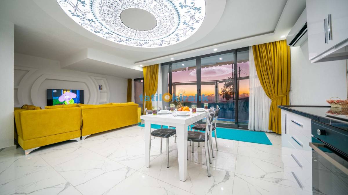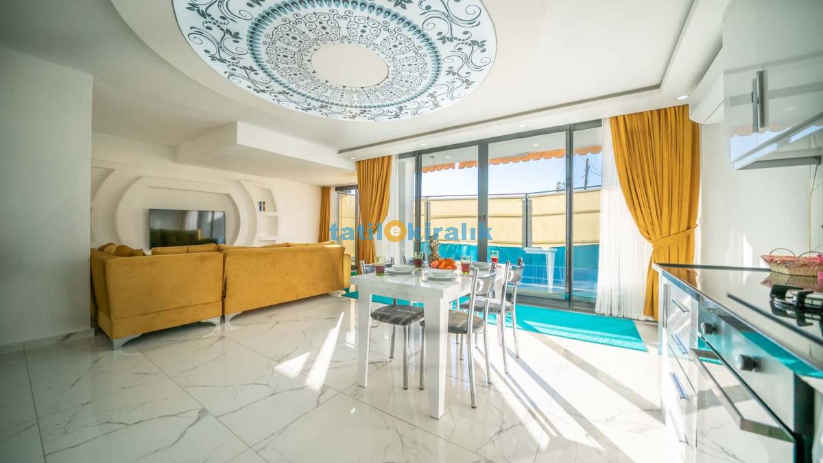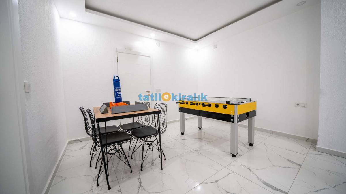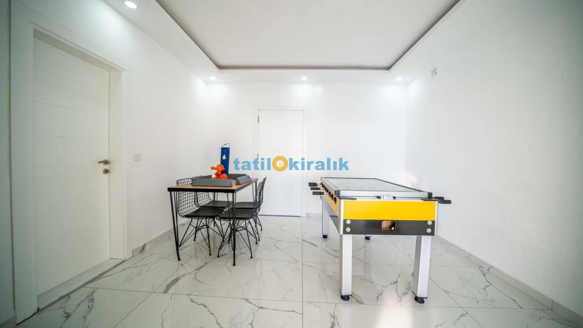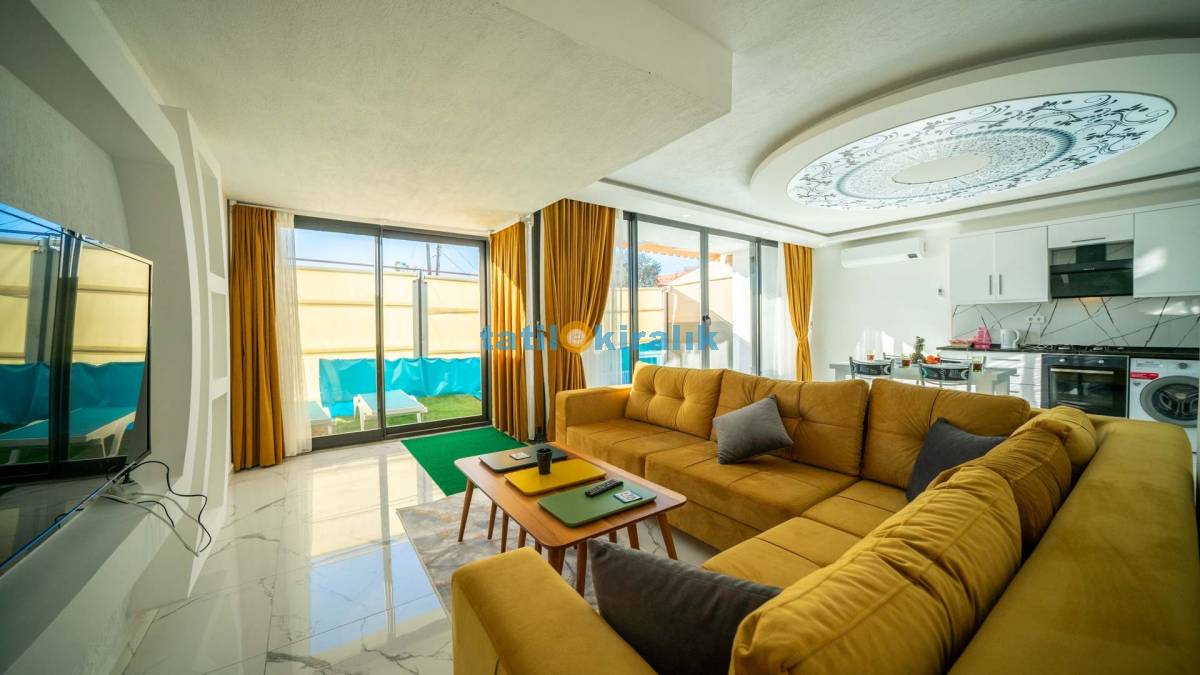 Salon Detayları: TV, modern oturma grubu, yemek masası, klima ve Langırt bulunmaktadır.