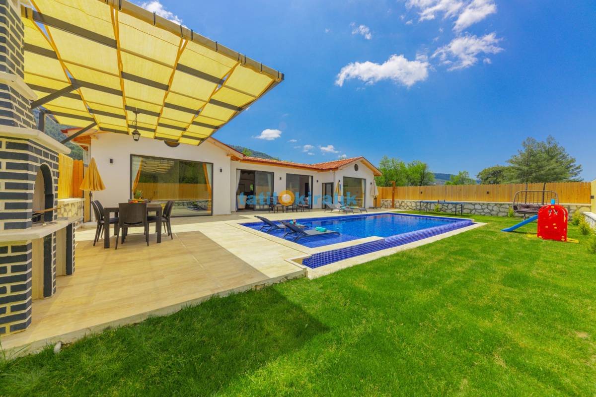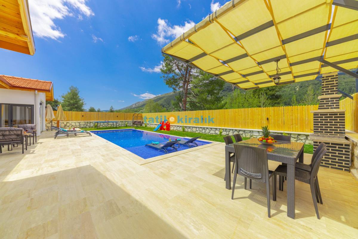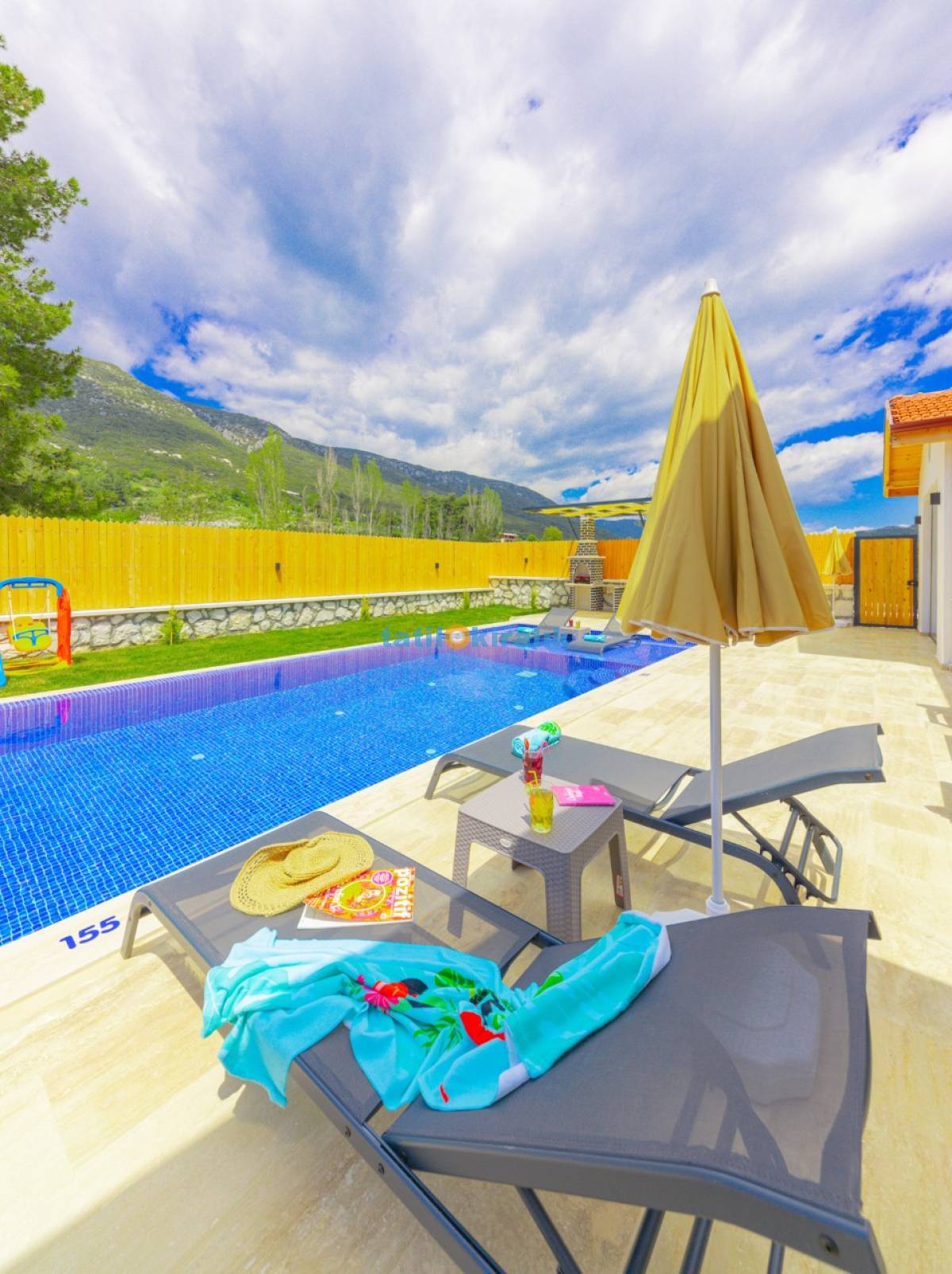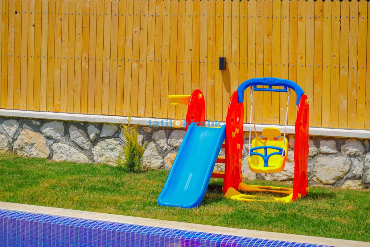 Havuz Terası Detayları : Şezlong, güneşlenme şemsiyesi, salıncak, barbekü, yemek masası ve sandalyeleri bulunmaktadır.