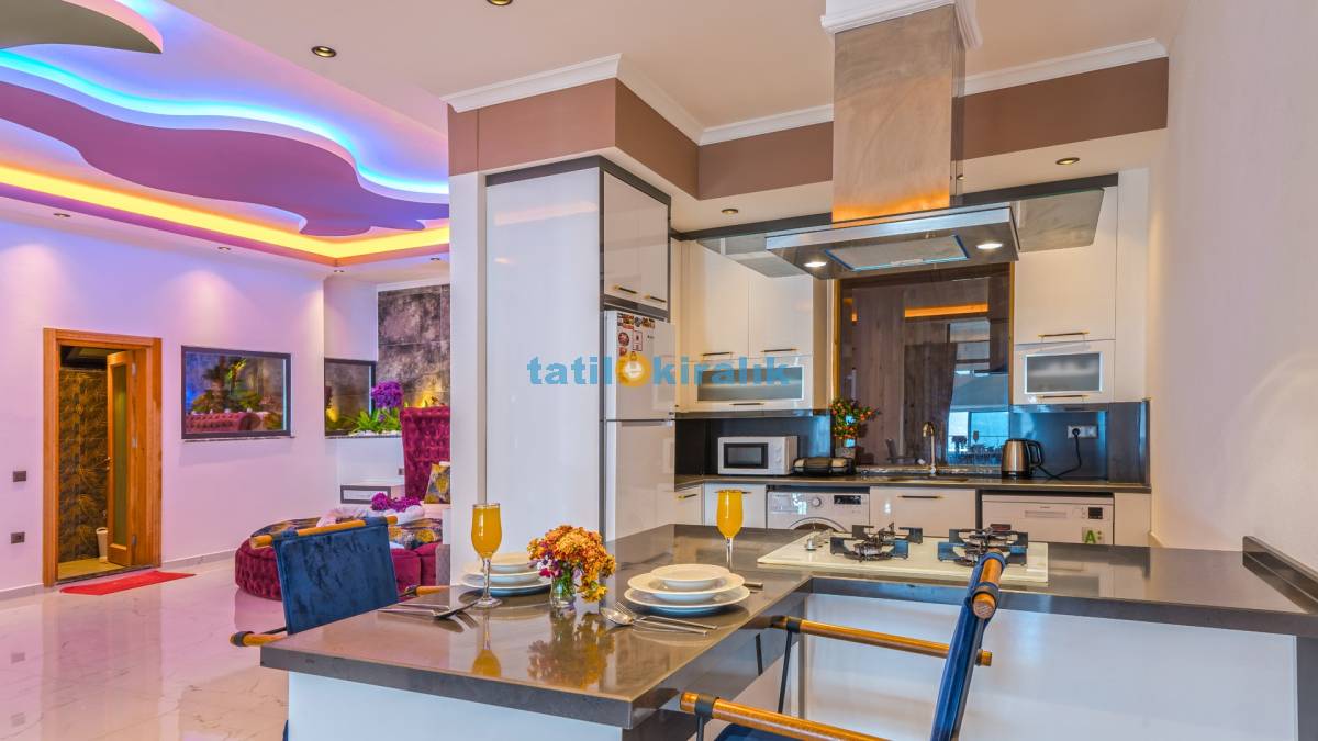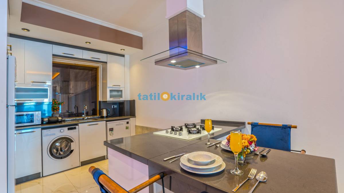 Mutfak Detayları : Buzdolabı , bulaşık makinesi , kahve makinası , çamaşır makinesi , 2 kişilik yemek takımı , tava-tencere, çatal-bıçak seti bulunmaktadır.