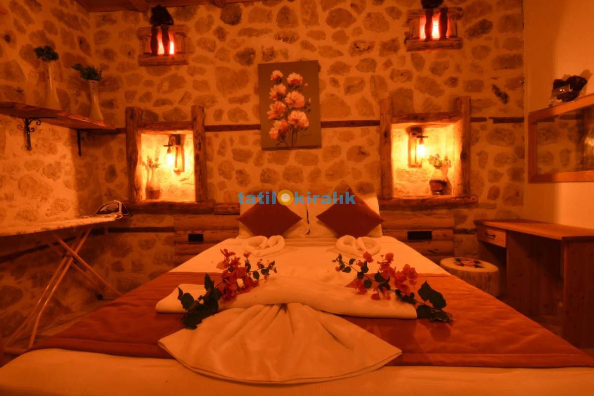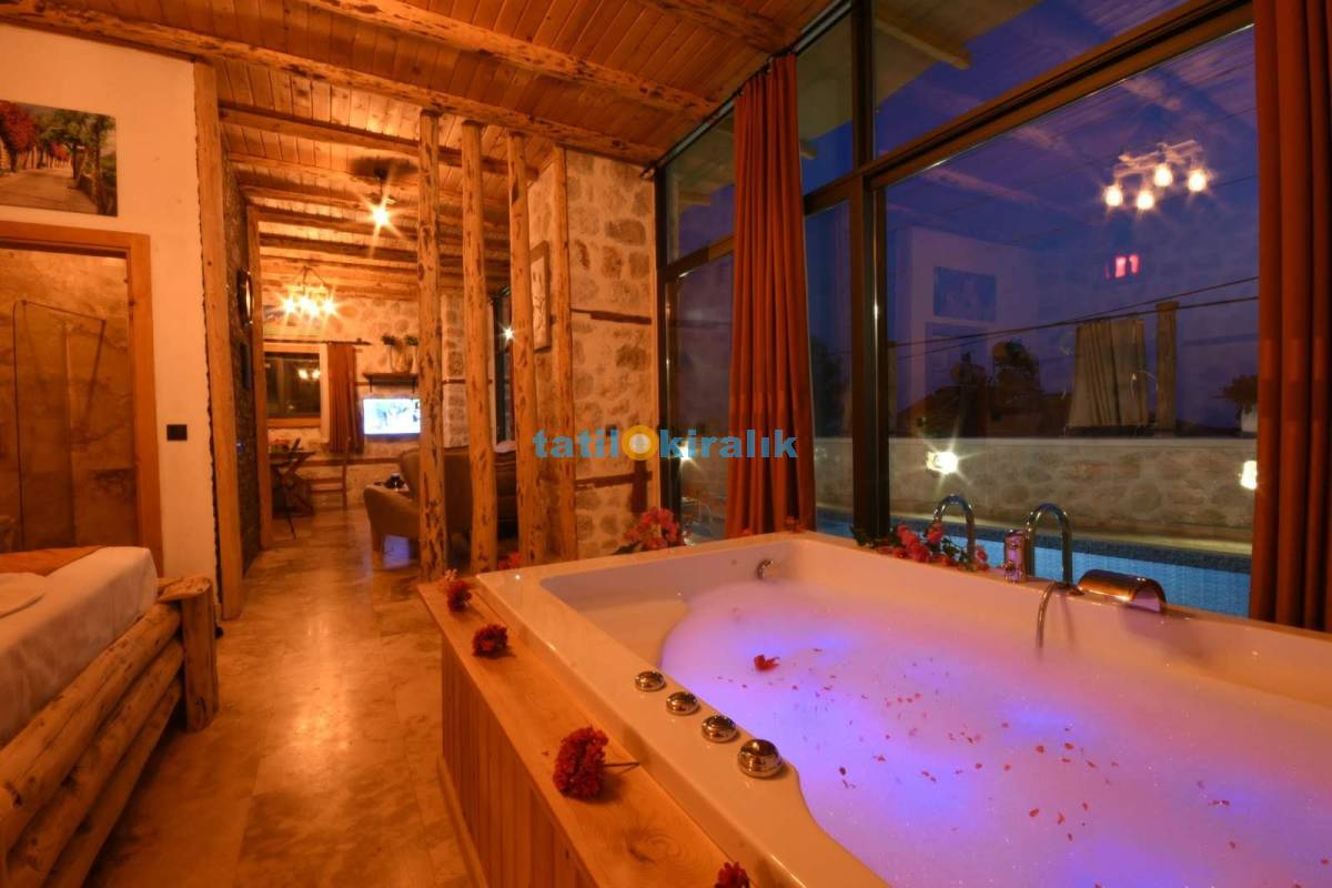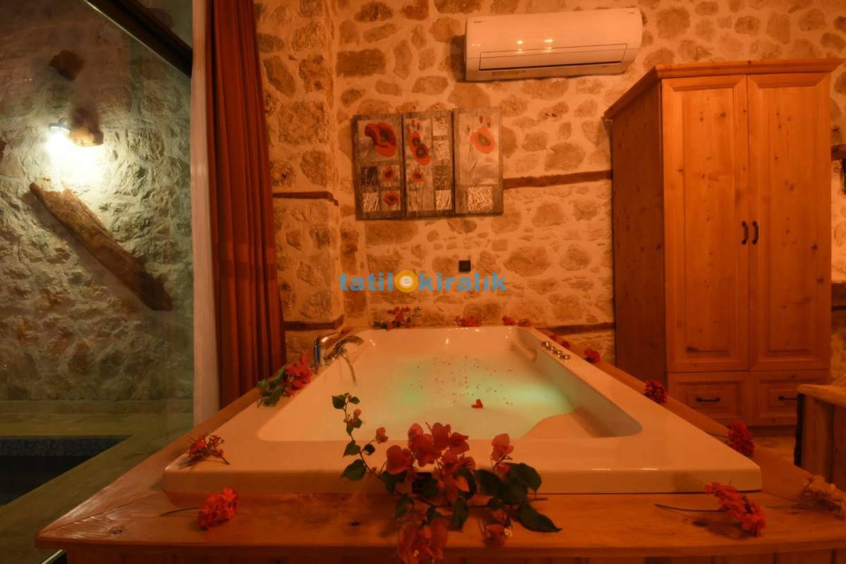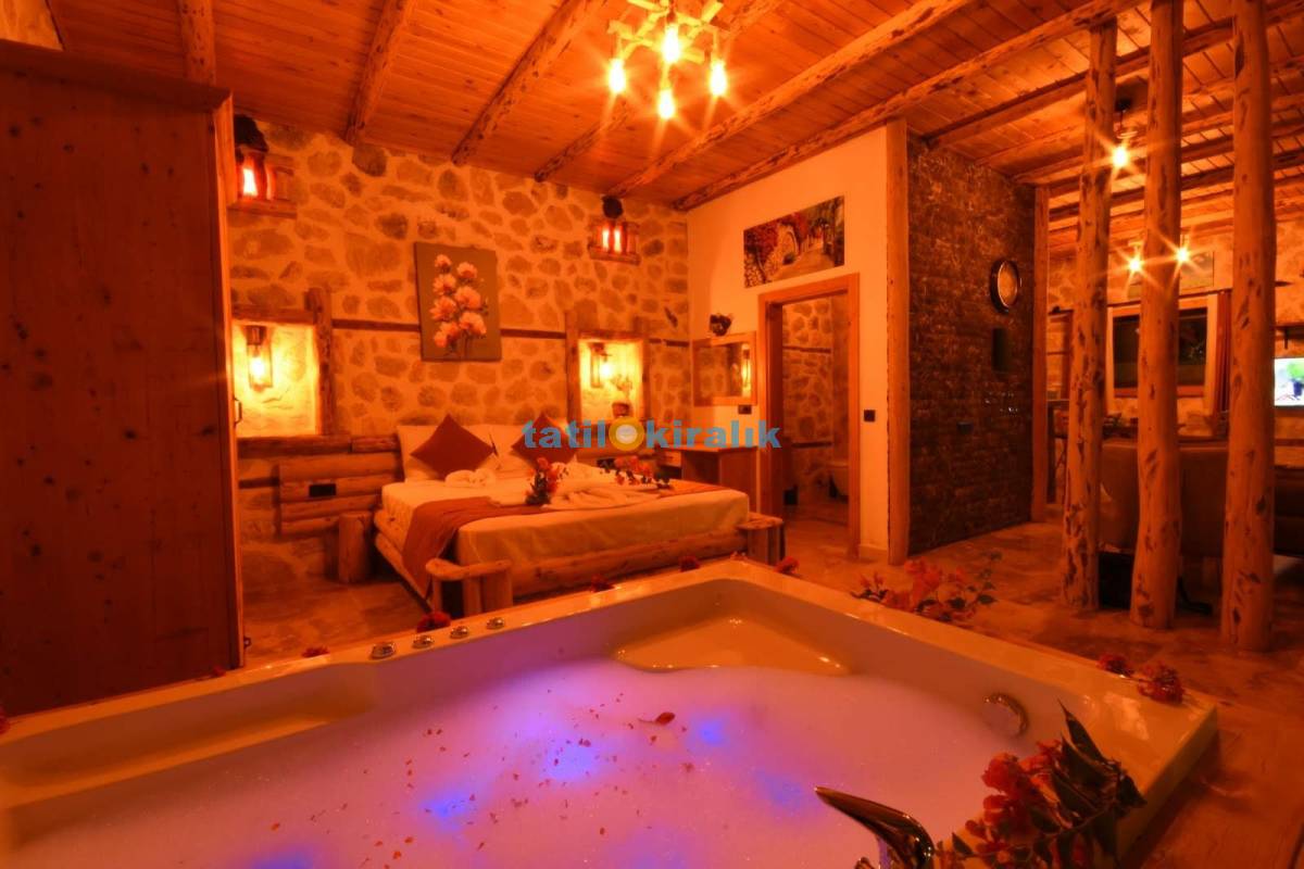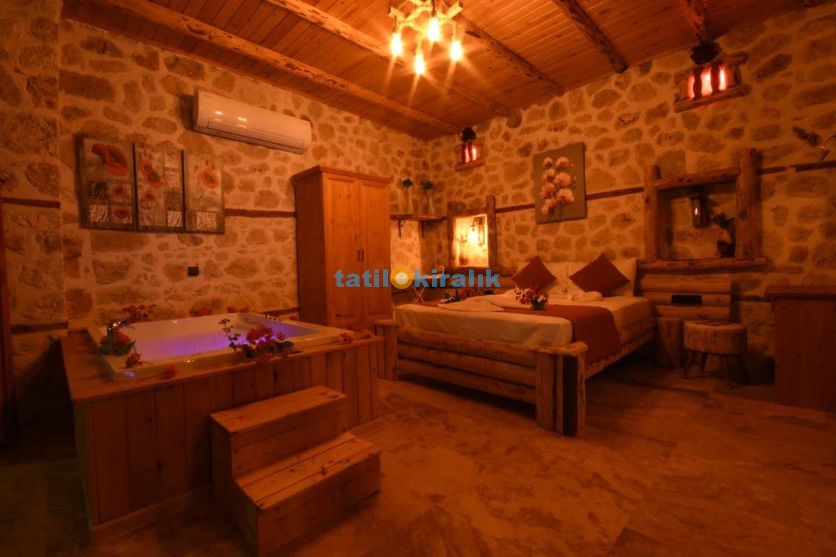 Detayları : Çift kişilik yatak, Elbise dolabı, Komodin, Makyaj masası, jakuzi TV , Klima, Banyo bulunmaktadır.
