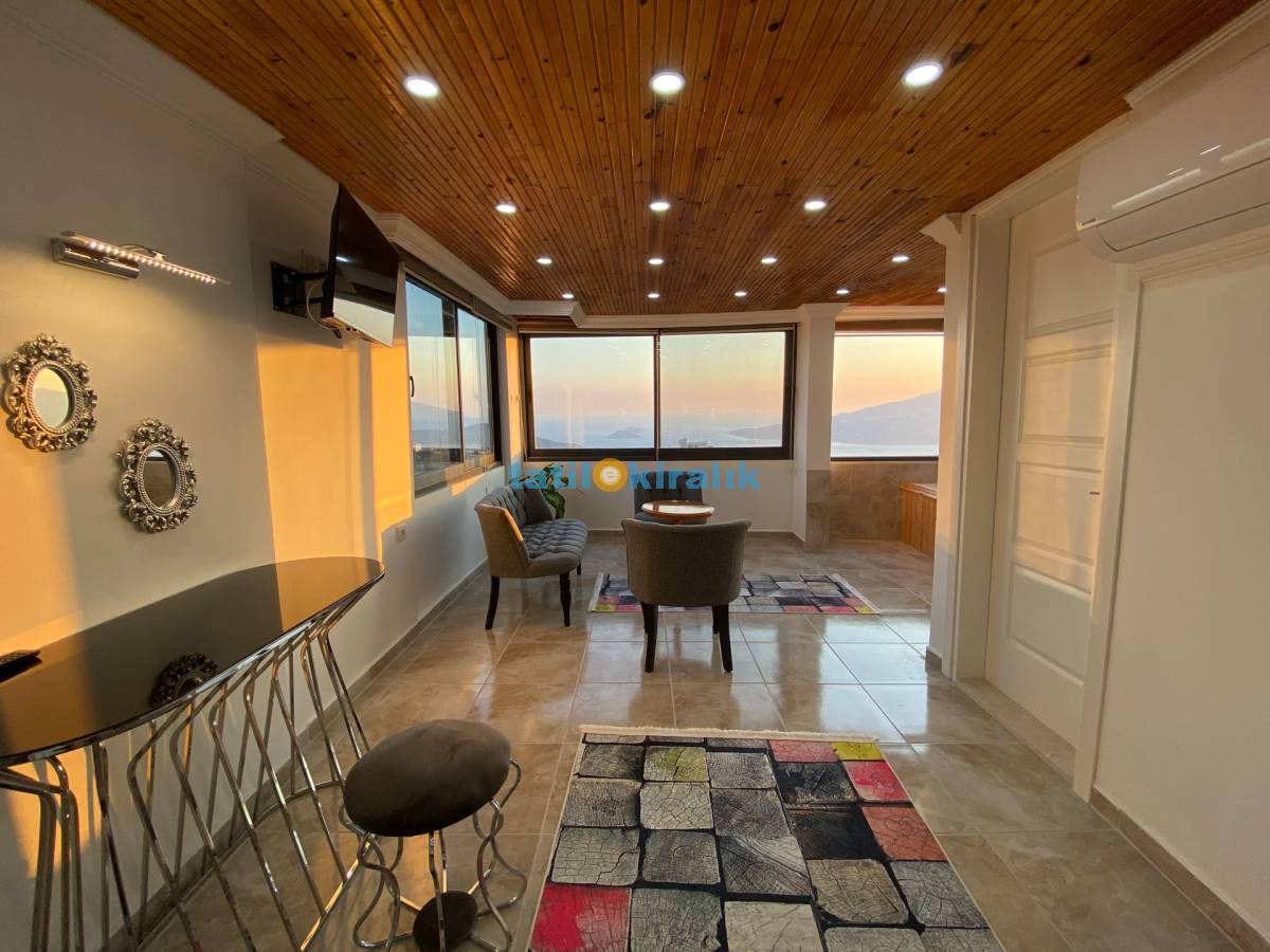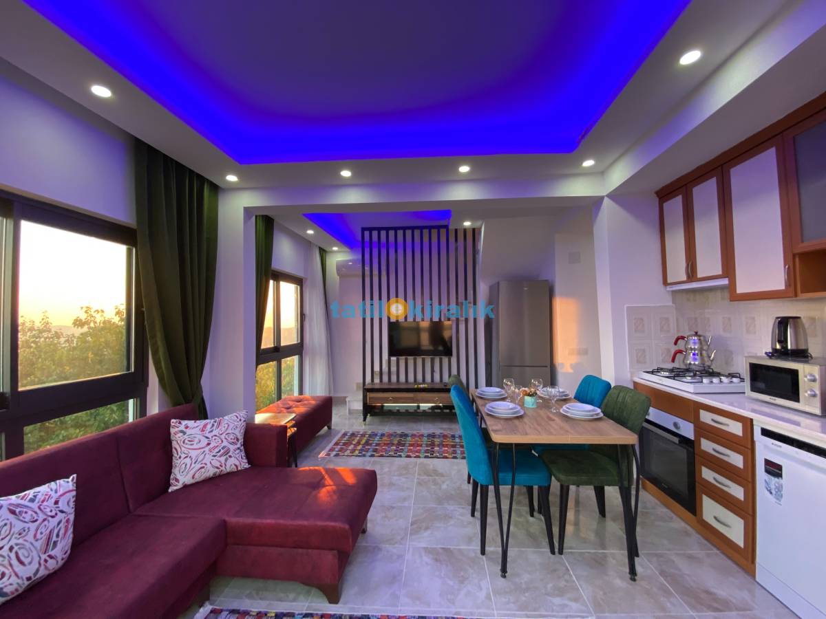 Salon Detayları: LCD TV, uydu alıcı, modern oturma grubu, yemek masası ve sandalyeler bulunmaktadır.