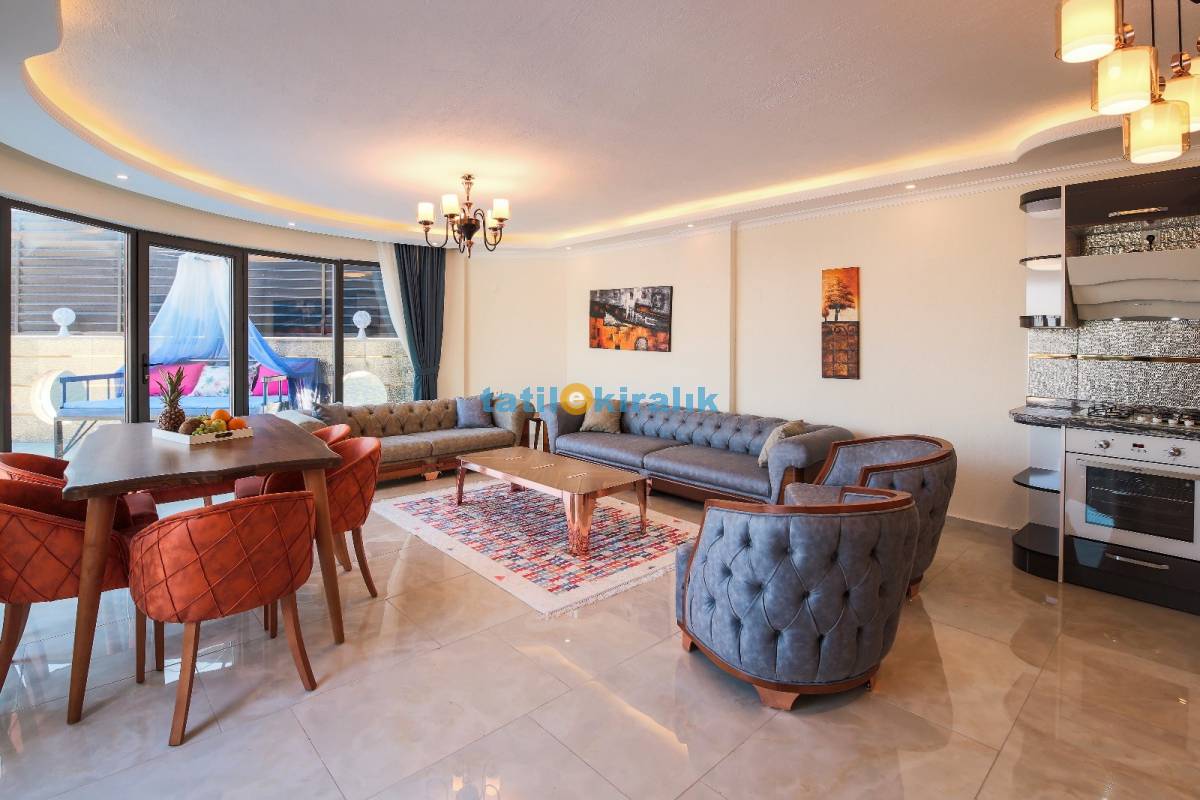 Salon Detayları: Oturma Grubu, Uydu TV (LCD), Kablosuz İnternet, Klima, 6 Kişilik Yemek Masası, Havuz Terasına Çıkış